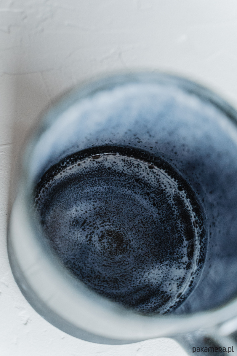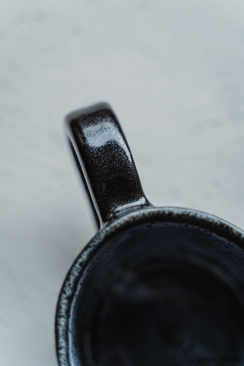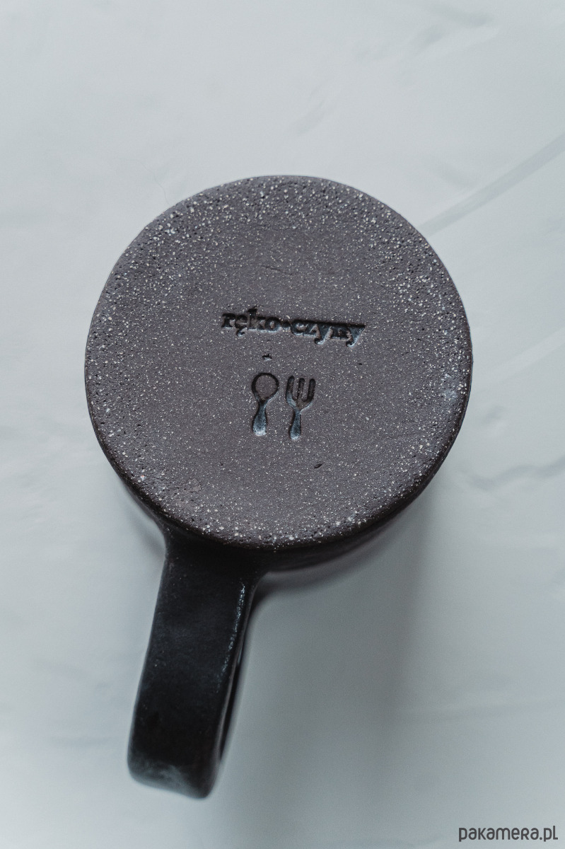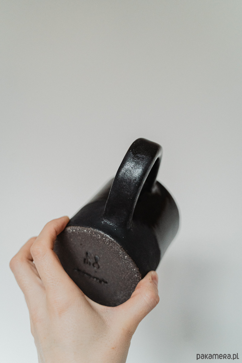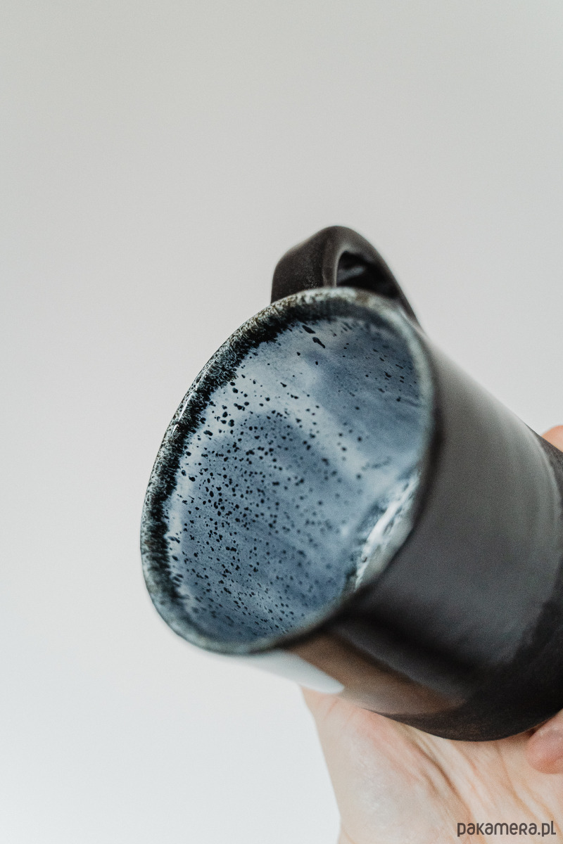 Kamionkowy kubek wykonany ręcznie z czarnej gliny. Pokryty czarnymi szkliwami - brokatowym i matowym.