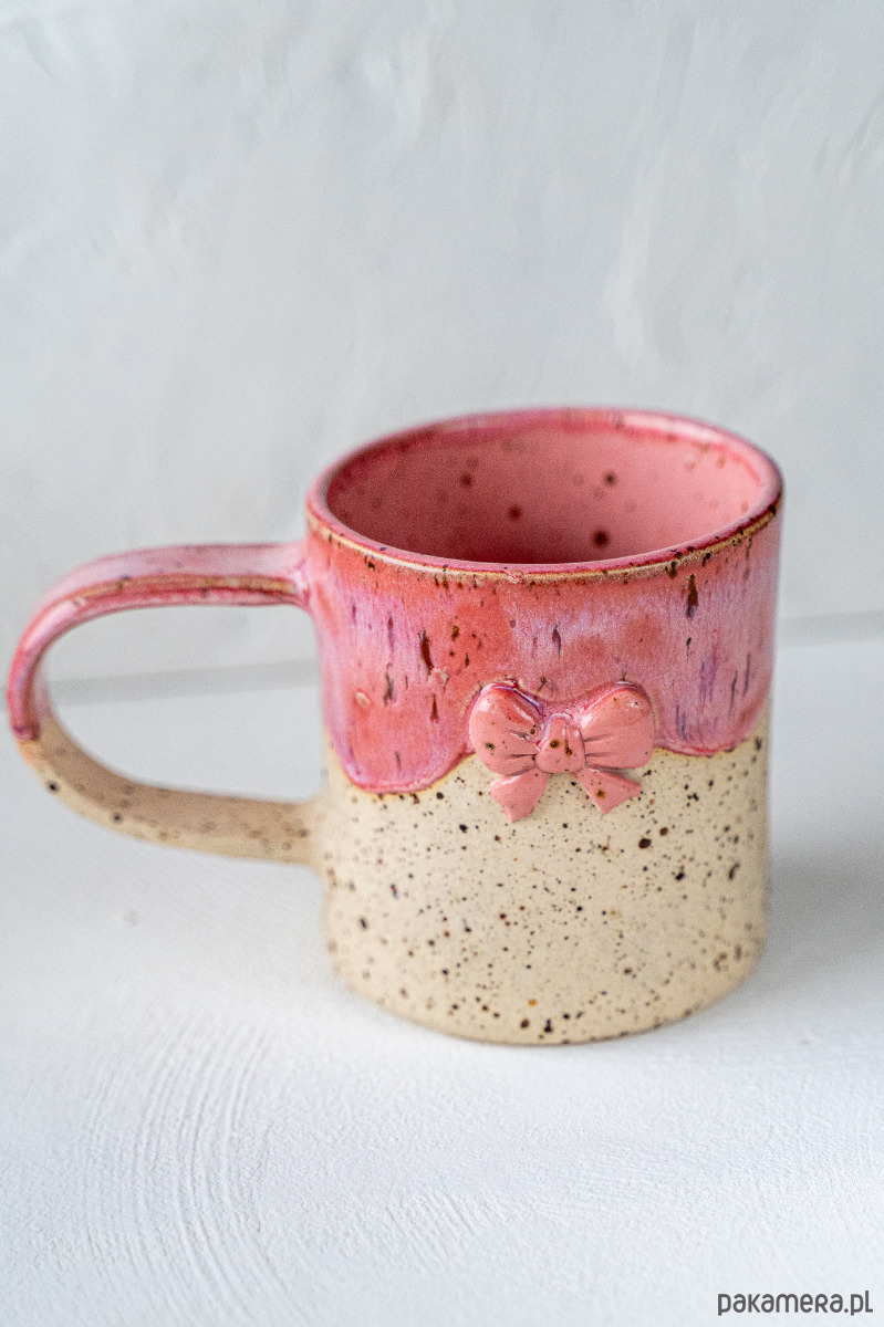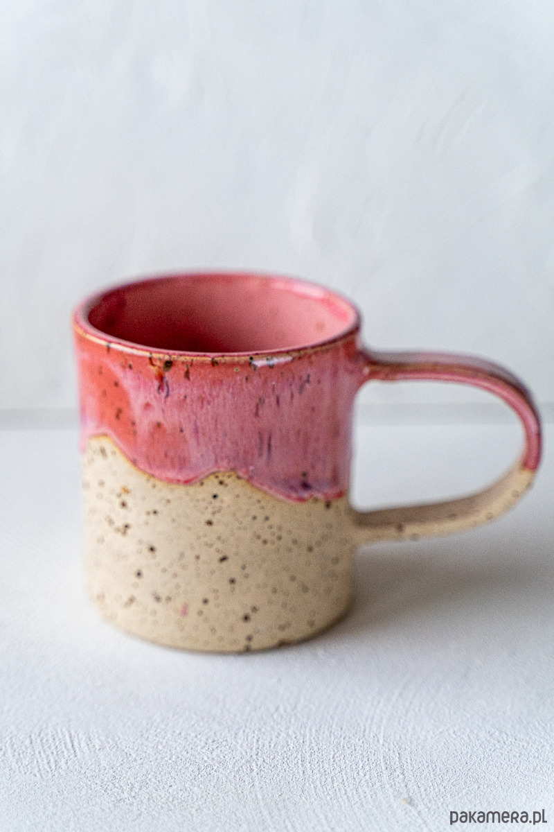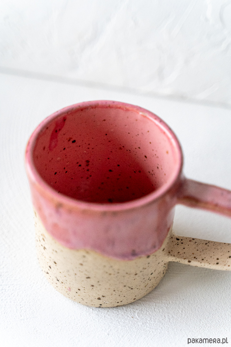 Kamionkowy kubek wykonany z jasnej, nakrapianej gliny, pokryty efektowymi szkliwami.