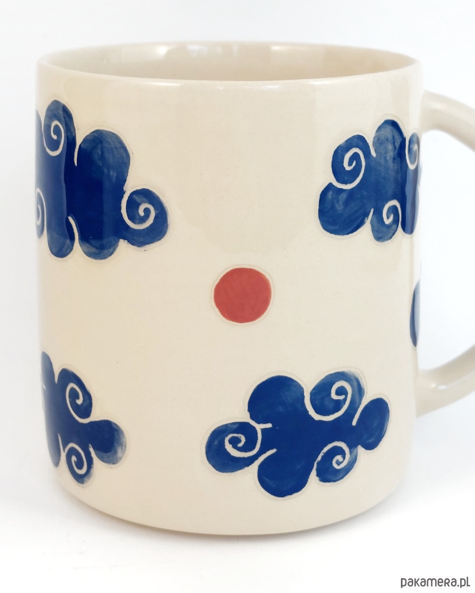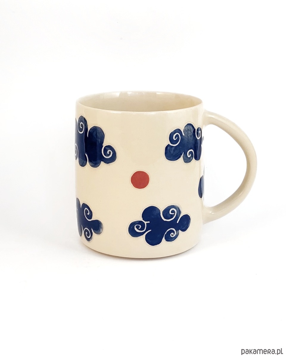 Kubek z namalowanymi chmurami w stylu japońskim.
