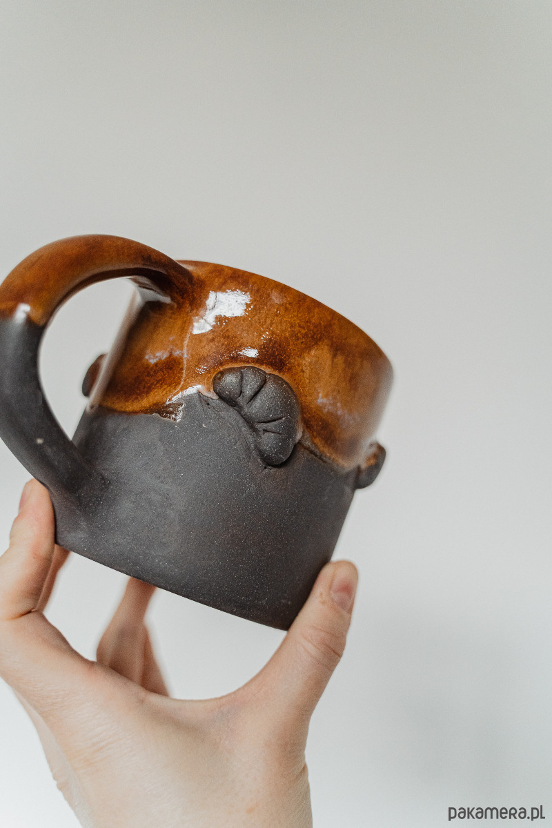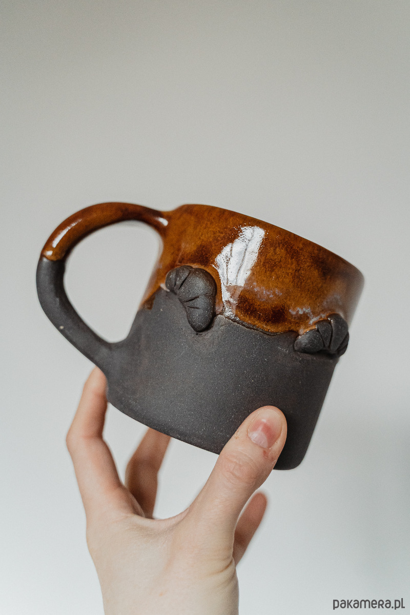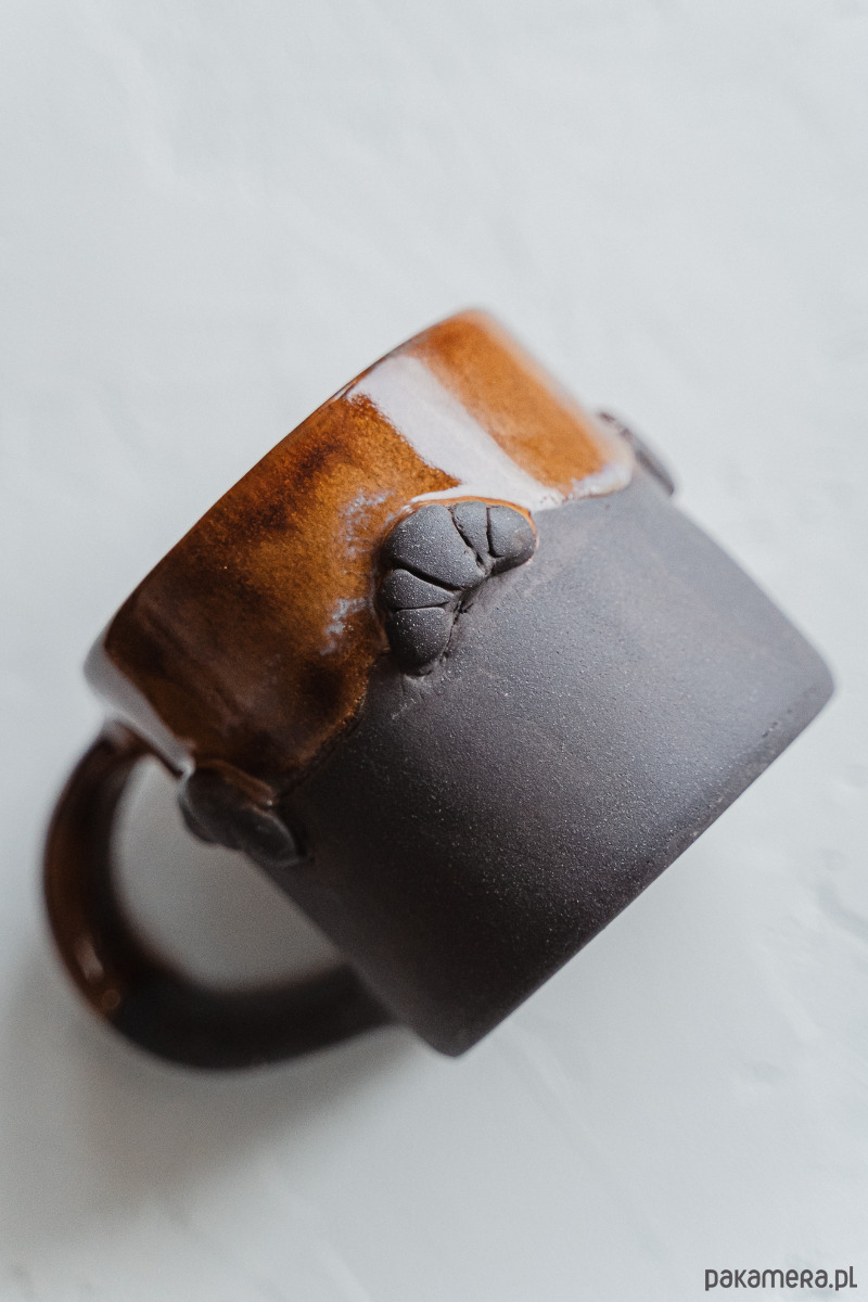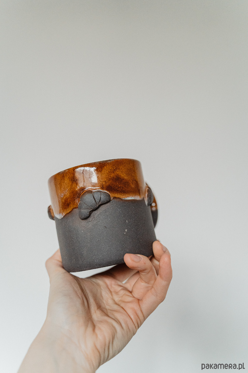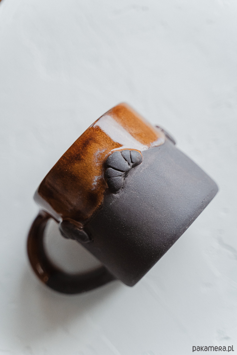Kamionkowy kubek wykonany z czarnej gliny. Górna część kubka pokryta jest szkliwem w ciepłych, naturalnych odcieniach brązu i beżu, które delikatnie przechodzą między sobą, tworząc efekt przypominający karmel, dolna część pozostaje matowa, surowa, co nadaje całości rustykalny, naturalny charakter. Unikalnym akcentem są miniaturowe rogaliki, które zdobią powierzchnię kubka.