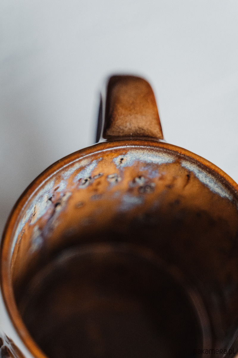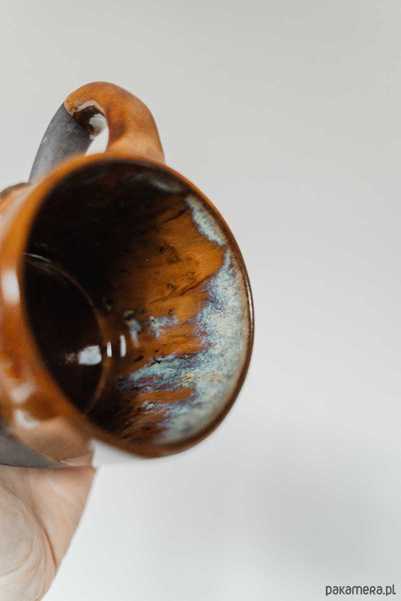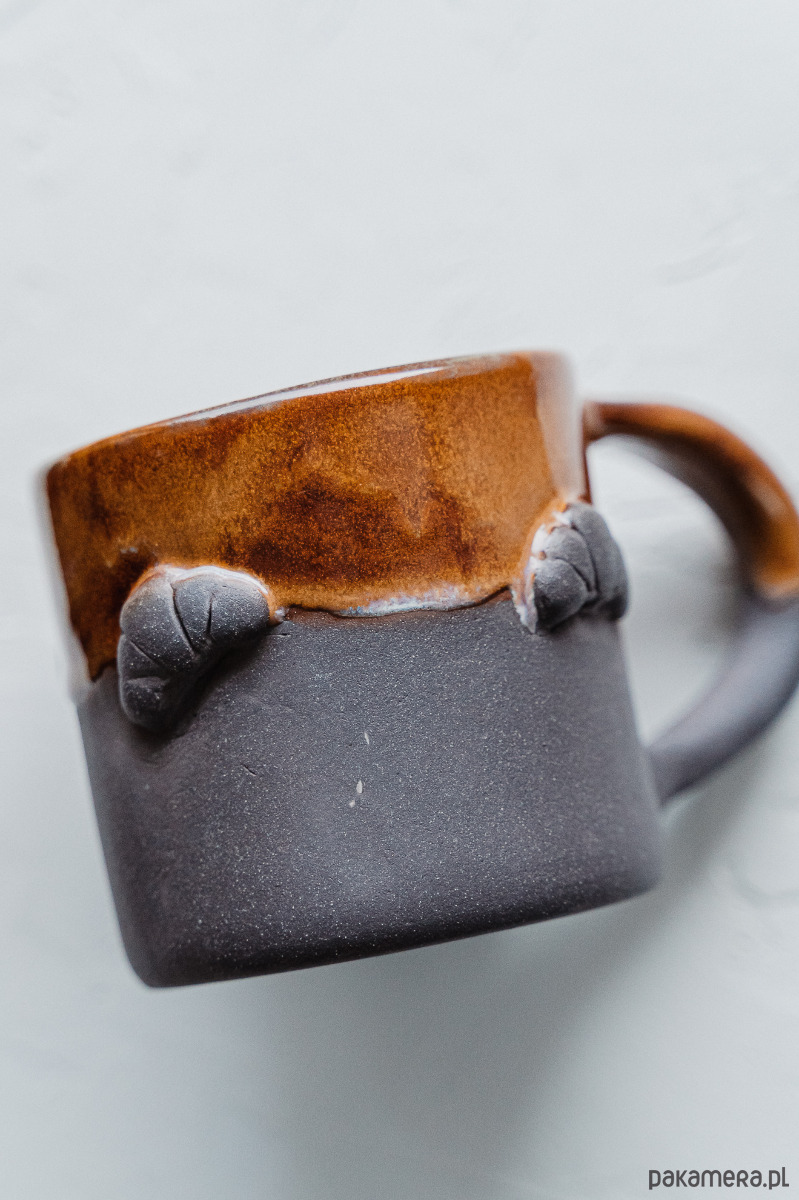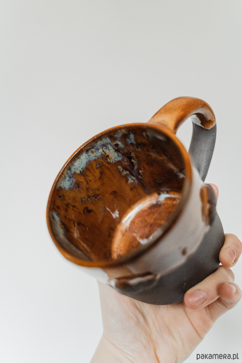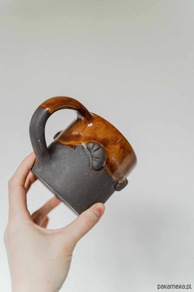 Kamionkowy kubek wykonany z czarnej gliny. Górna część kubka pokryta jest szkliwem w ciepłych, naturalnych odcieniach brązu i beżu, które delikatnie przechodzą między sobą, tworząc efekt przypominający karmel, dolna część pozostaje matowa, surowa, co nadaje całości rustykalny, naturalny charakter. Unikalnym akcentem są miniaturowe rogaliki, które zdobią powierzchnię kubka.