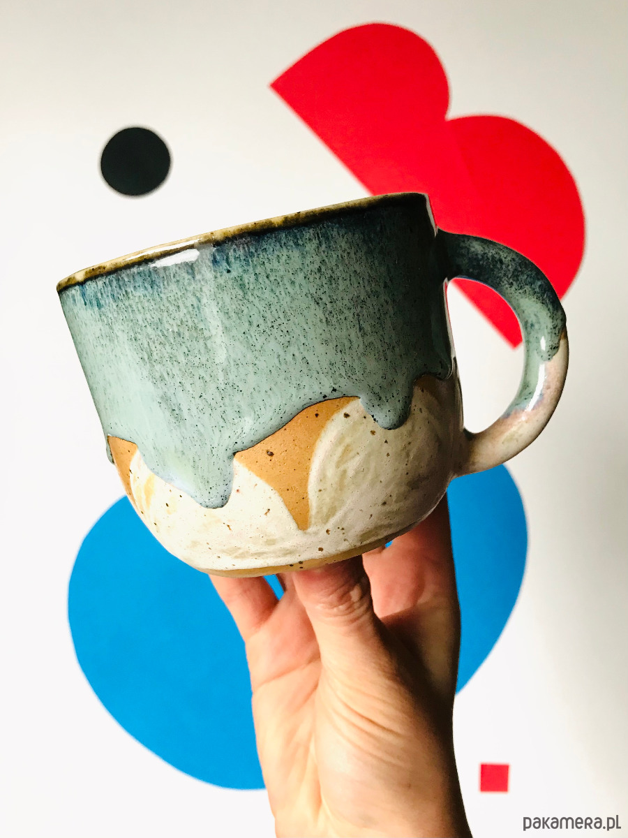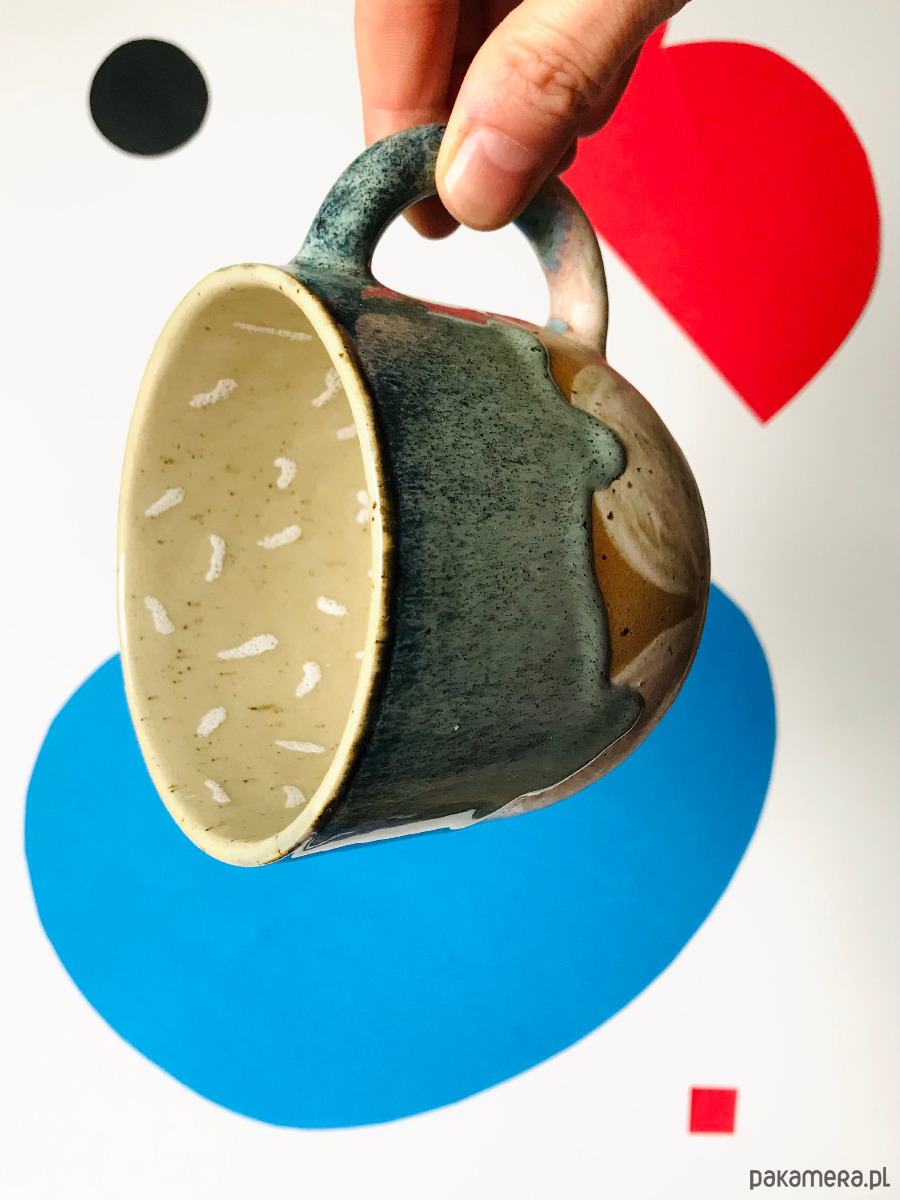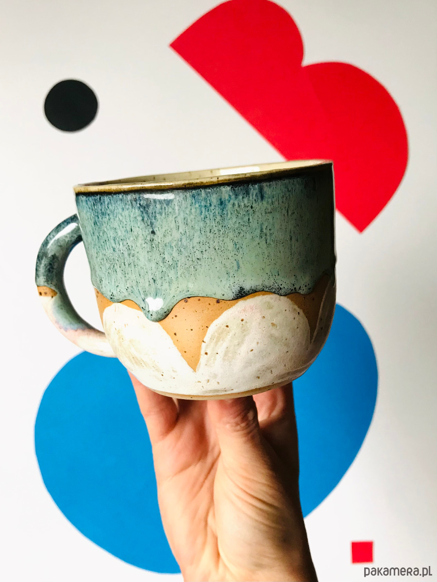 Kubek ceramiczny z uchem Jezioro, wielobarwnie szkliwiony. W środku cętkowany. Wykonany z nakrapianej gliny. Stworzony, by umilić Ci każdy dzień.