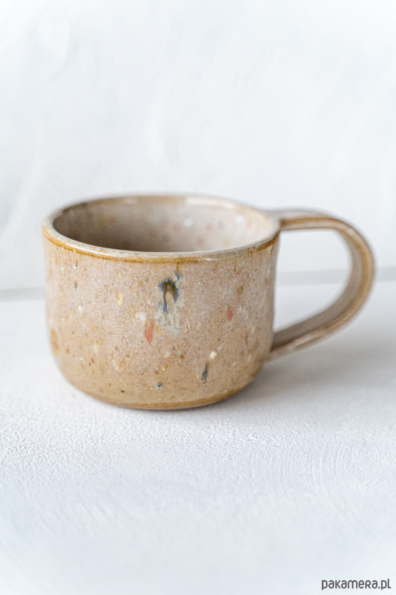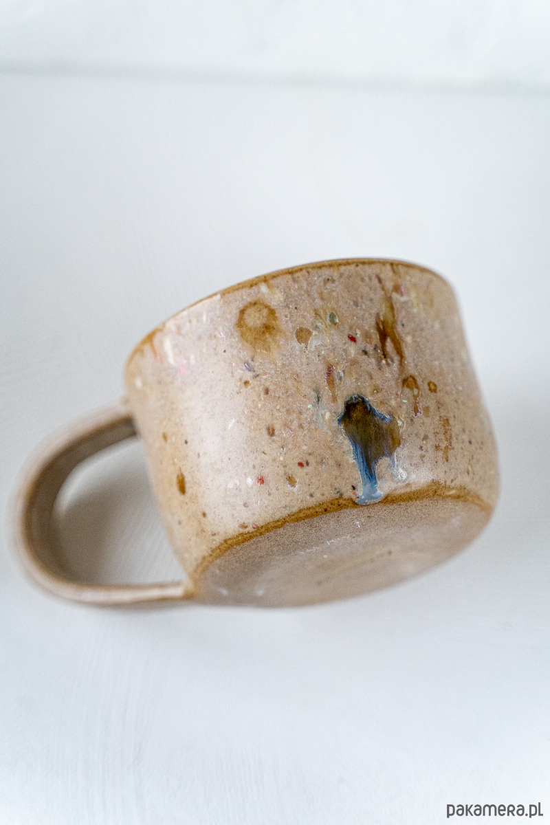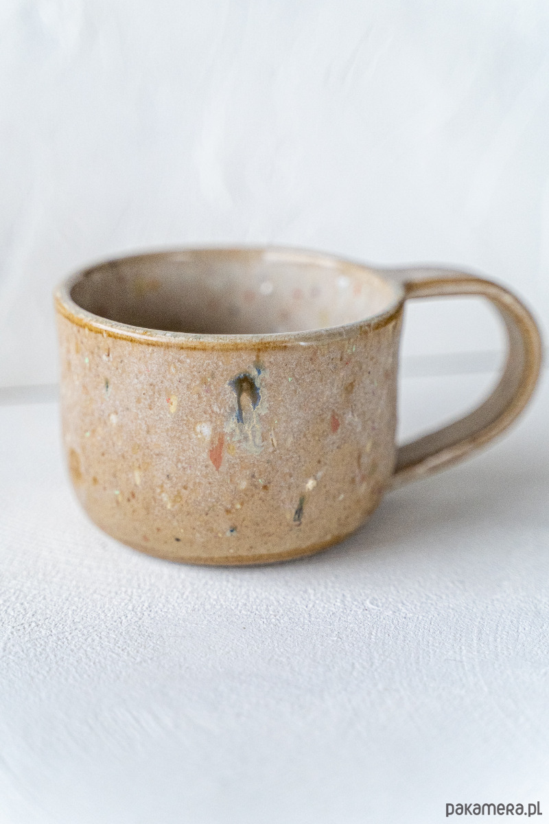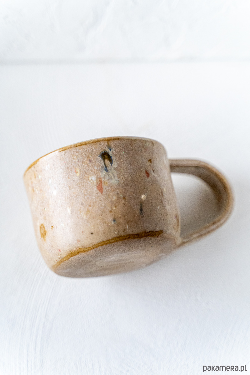 Kamionkowy kubek wykonany ręcznie z brązowej gliny, pokryty błyszczącym, nakrapianym szkliwem.