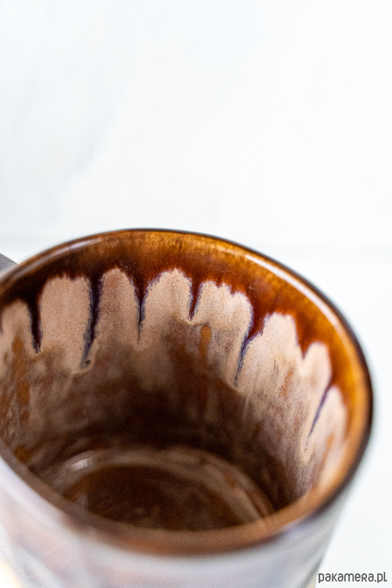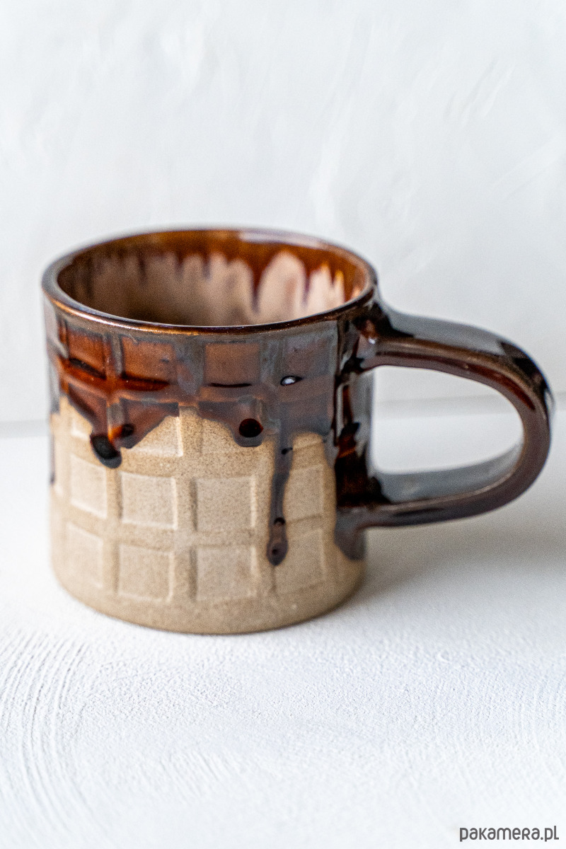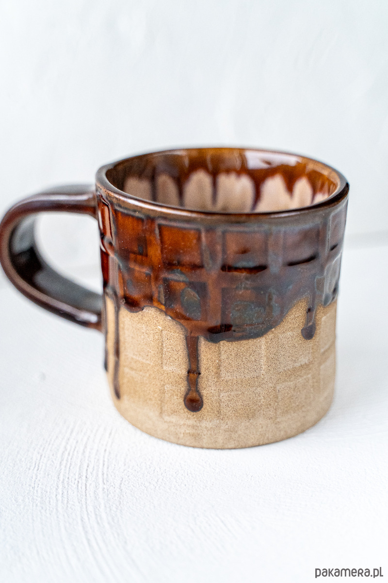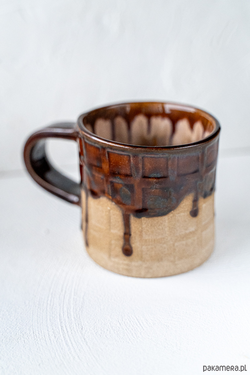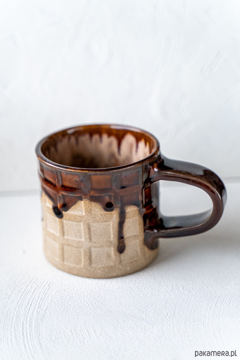 Kamionkowy kubek wykonany z brązowej gliny, pokryty efektownym szkliwem, z tłoczonym wzorem.