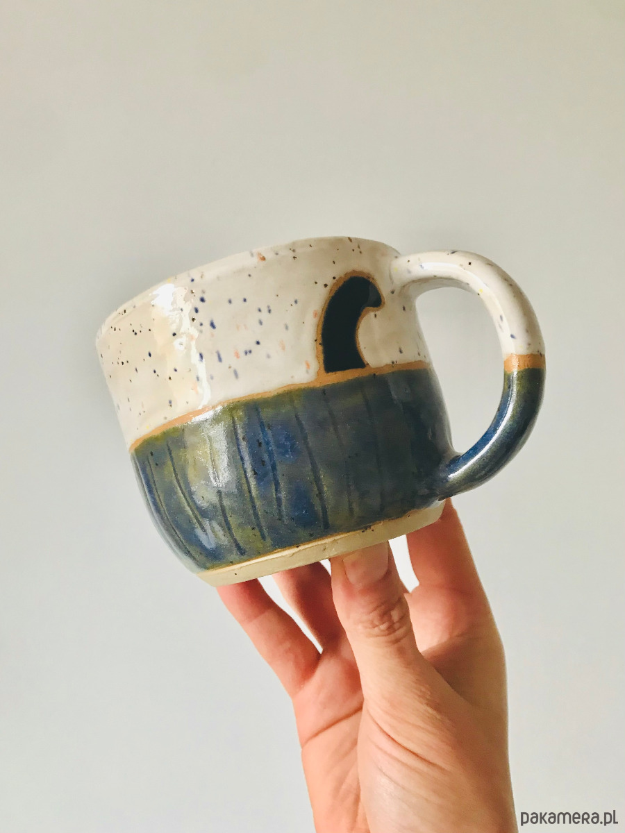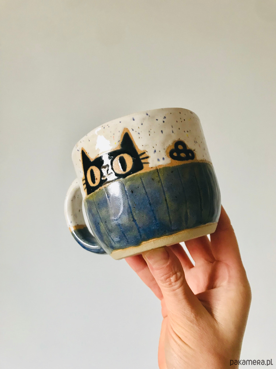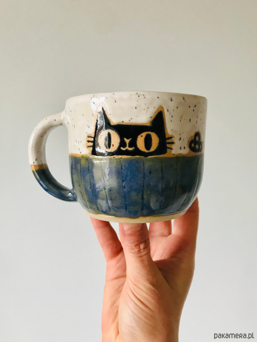 Kubek ceramiczny z Kotem, wielobarwnie szkliwiony.
