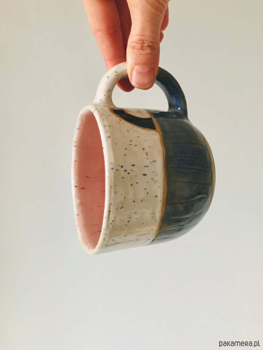 Wykonany z nakrapianej gliny, przy użyciu szkliw przeznaczonych do kontaktu z żywnością.