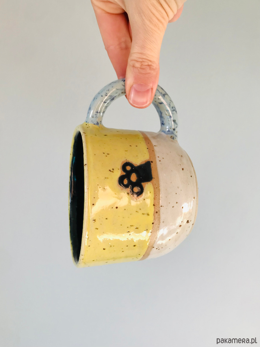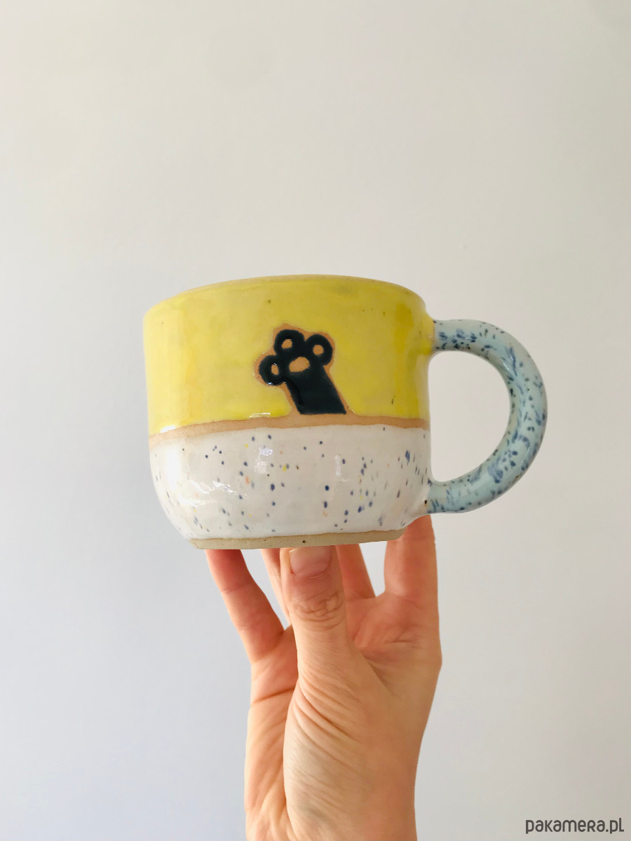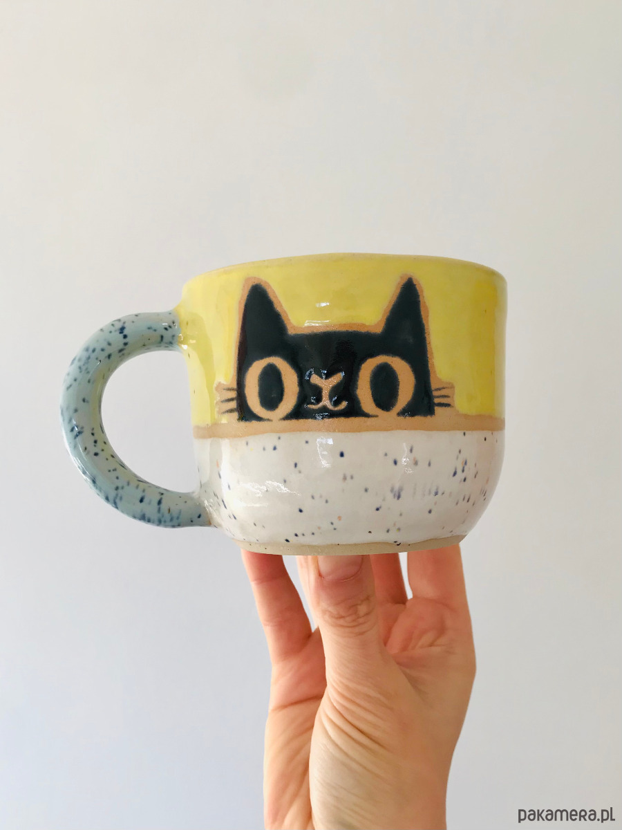 Kubek ceramiczny z Kotem, wielobarwnie szkliwiony.