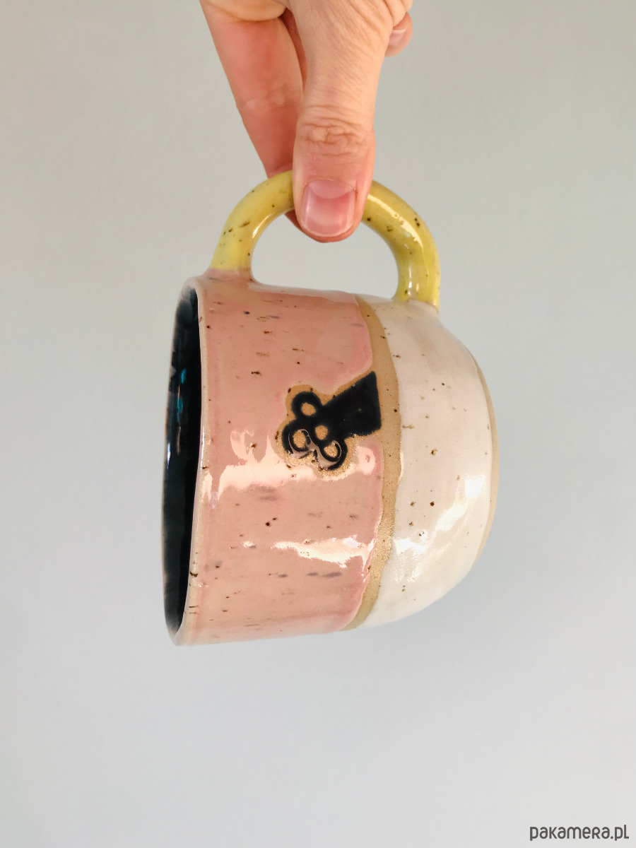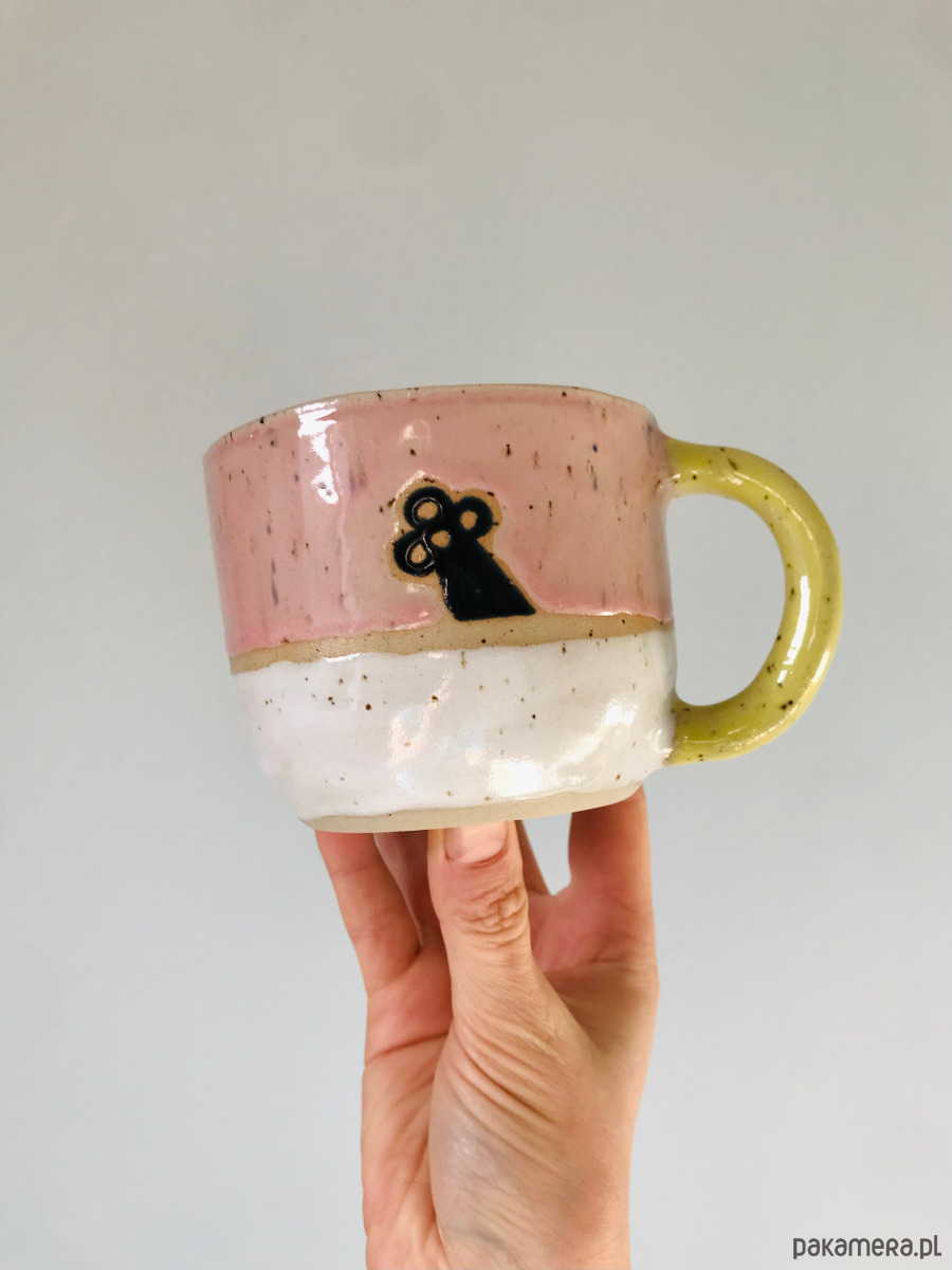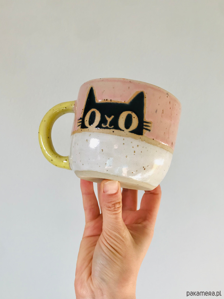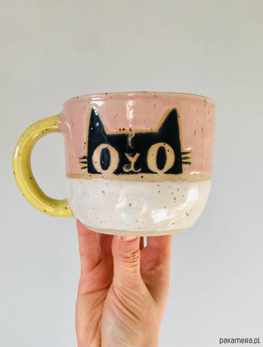 Kubek ceramiczny z Kotem, wielobarwnie szkliwiony.