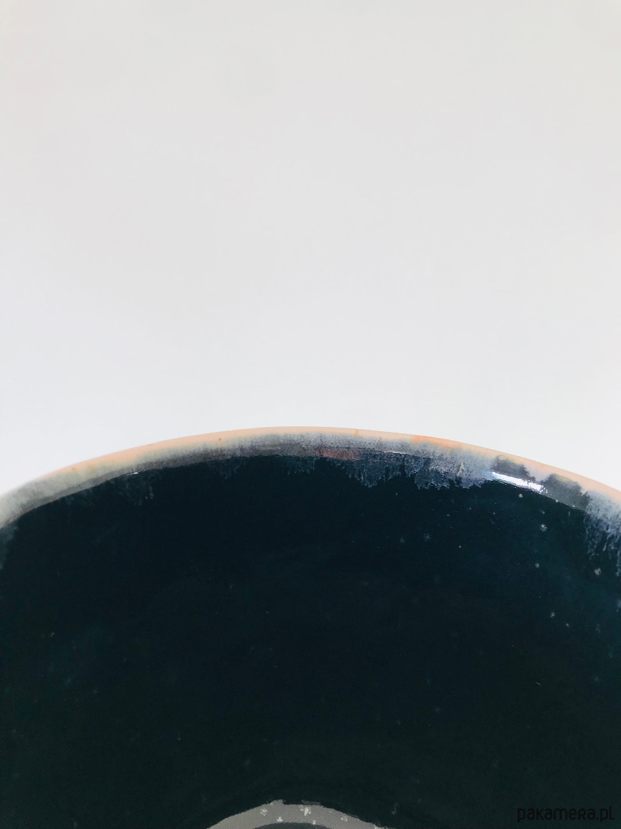 Wykonany z nakrapianej gliny, przy użyciu szkliw przeznaczonych do kontaktu z żywnością.