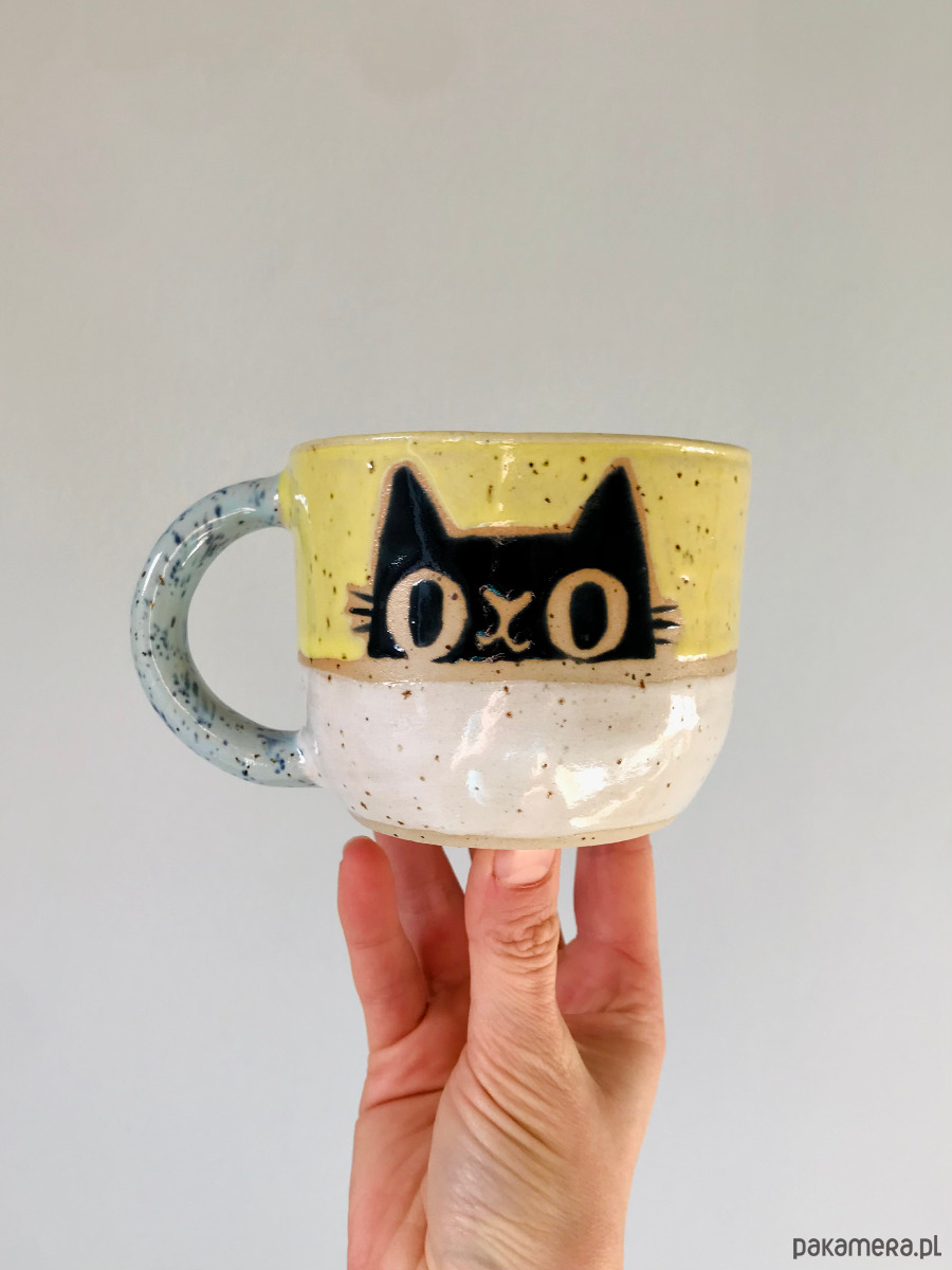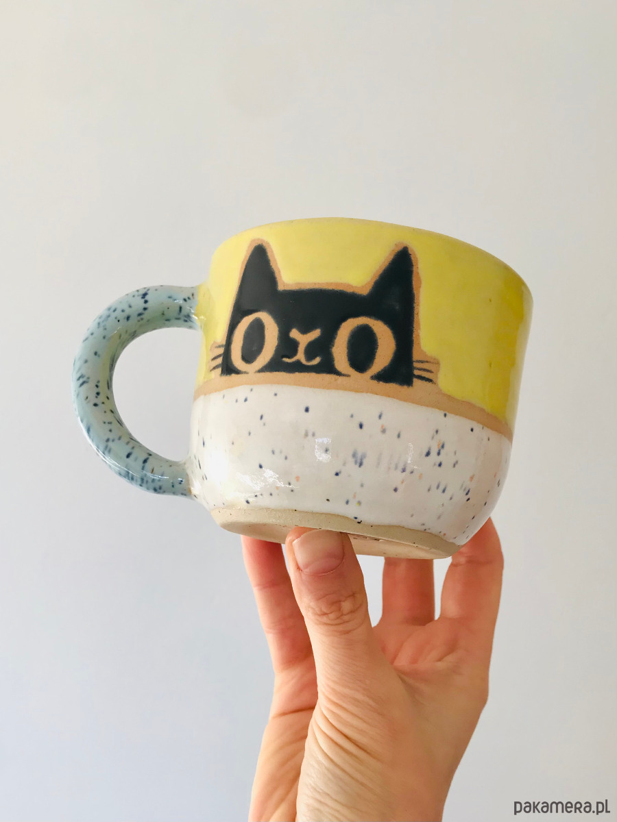 Kubek ceramiczny z Kotem, wielobarwnie szkliwiony.