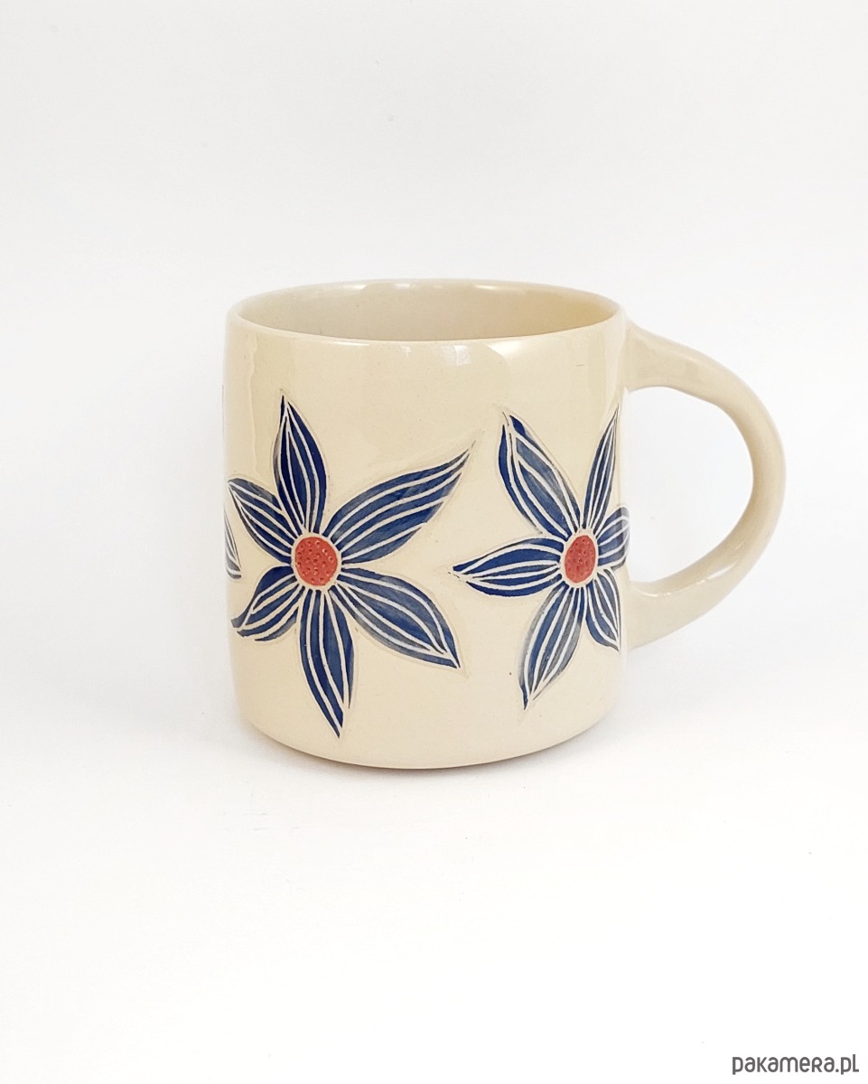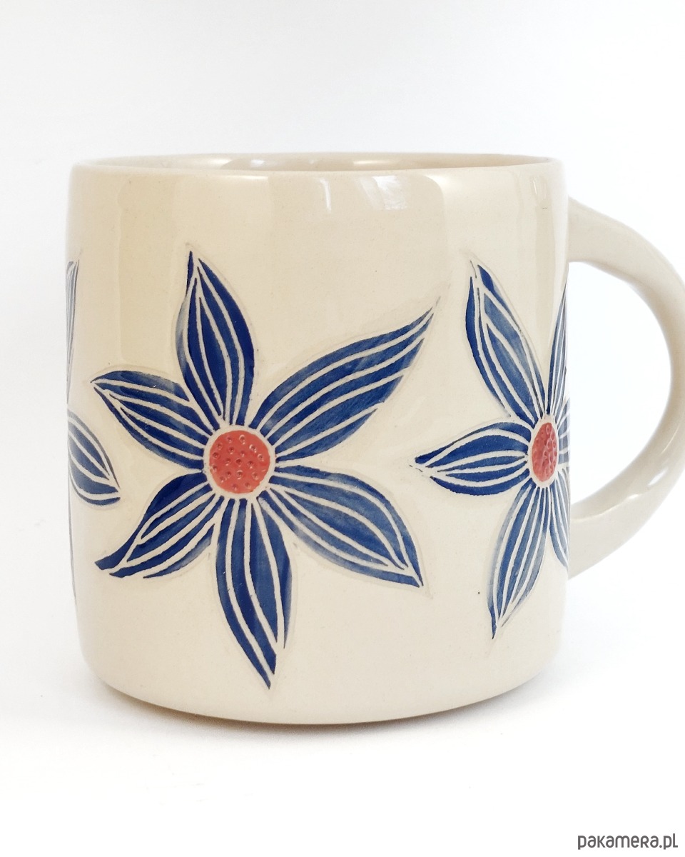 Kubek z namalowanymi niebieskimi kwiatami.