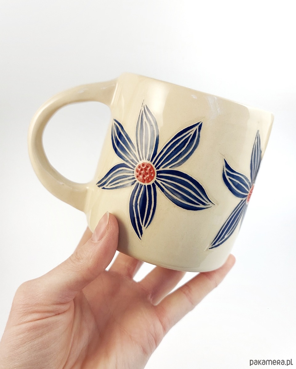 Kubeczek został ulepiony i ozdobiony ręcznie, dlatego posiada delikatnie nieregularny kształt, który nadaje mu unikatowy charakter.