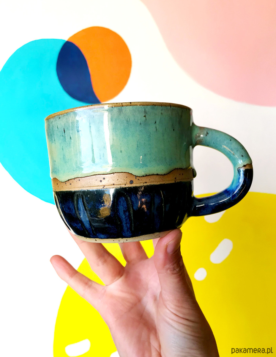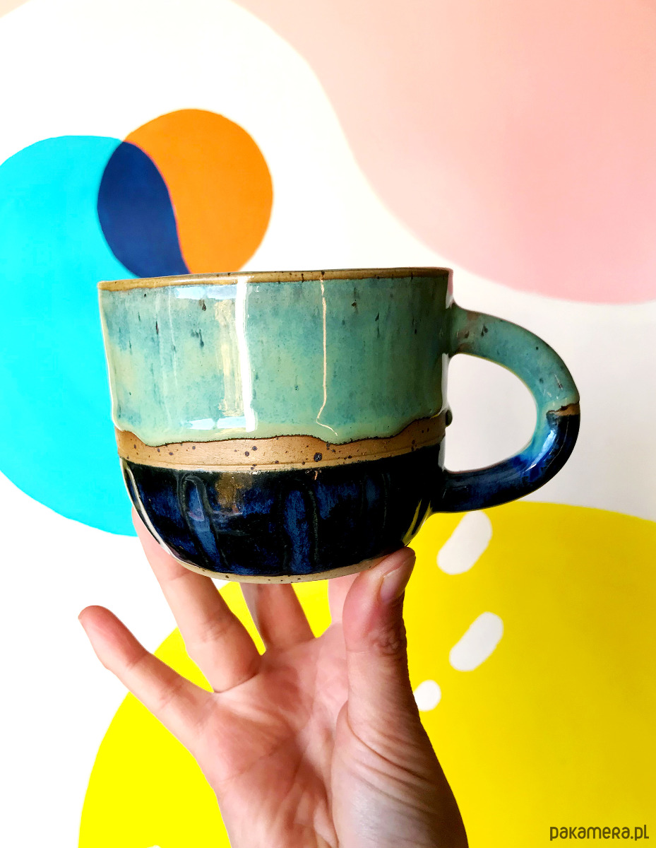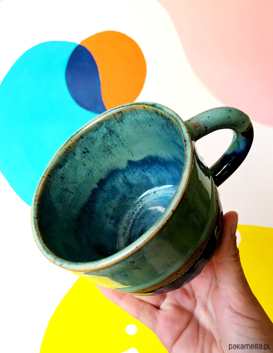 Kubek ceramiczny z uchem, wielobarwnie szkliwiony. W środku turkusowy. Wykonany z nakrapianej gliny. Stworzony, by umilić Ci każdy dzień.