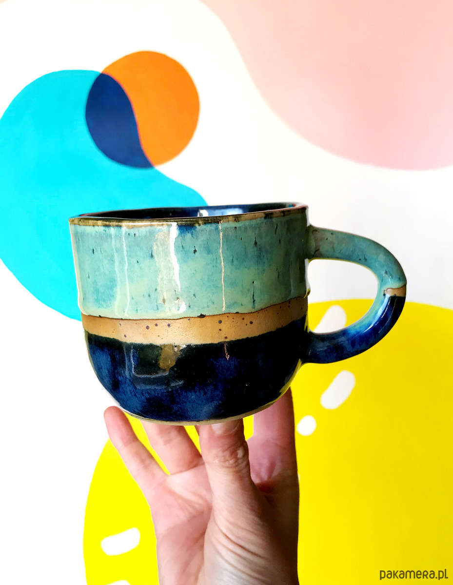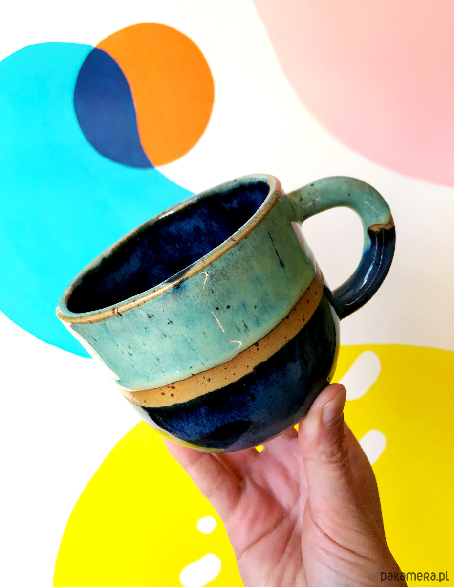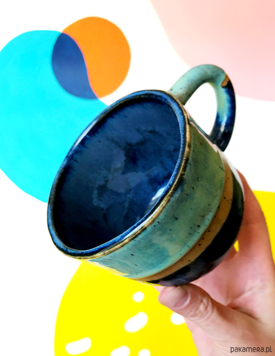 Kubek ceramiczny z uchem, wielobarwnie szkliwiony. W środku granatowy. Wykonany z nakrapianej gliny. Stworzony, by umilić Ci każdy dzień.
