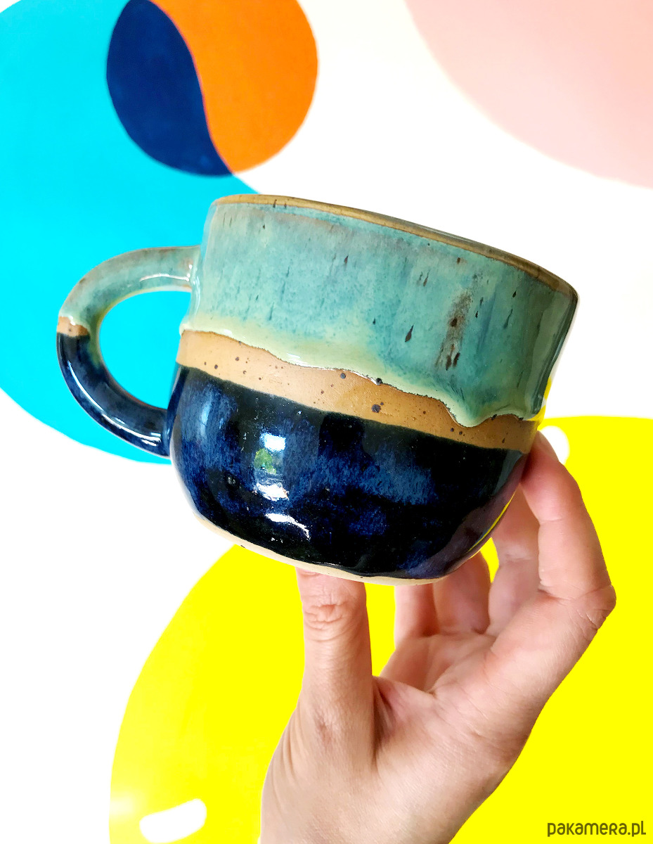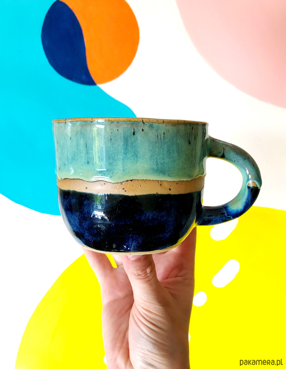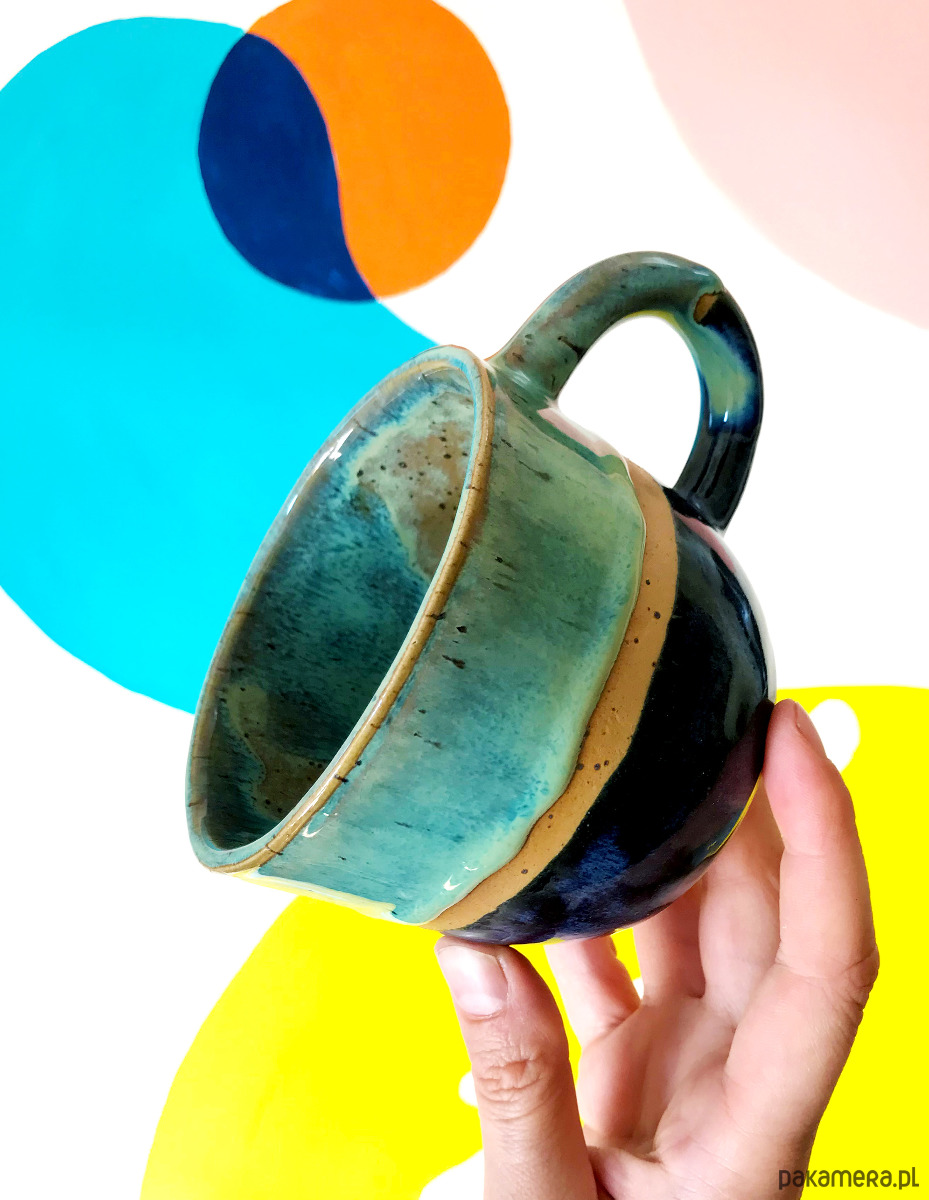 Kubek ceramiczny z uchem, wielobarwnie szkliwiony. W środku turkusowy. Wykonany z nakrapianej gliny. Stworzony, by umilić Ci każdy dzień.
