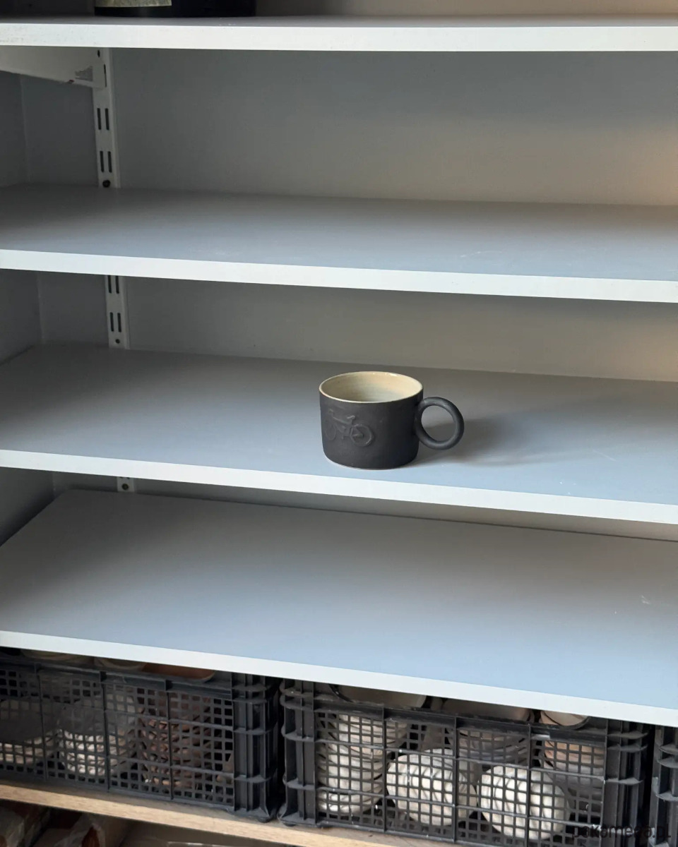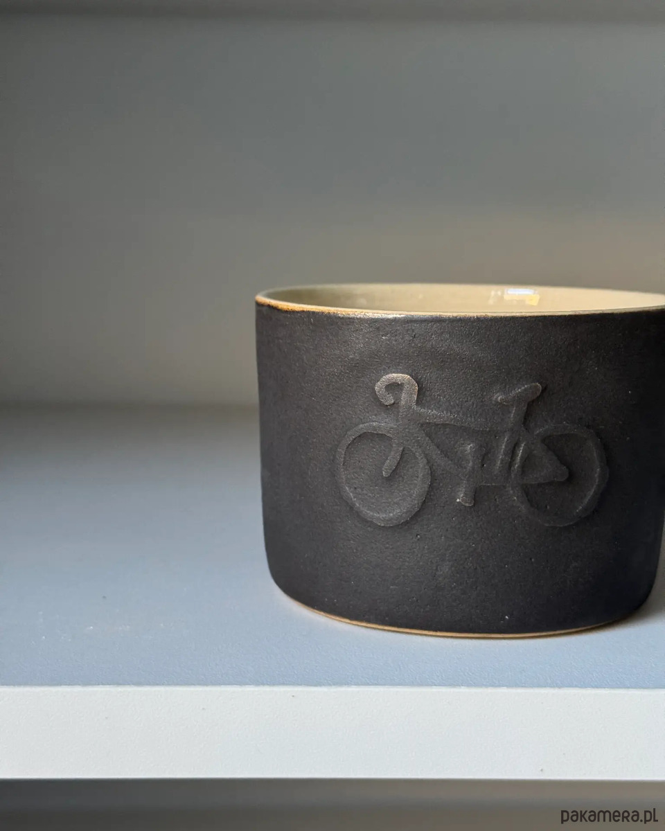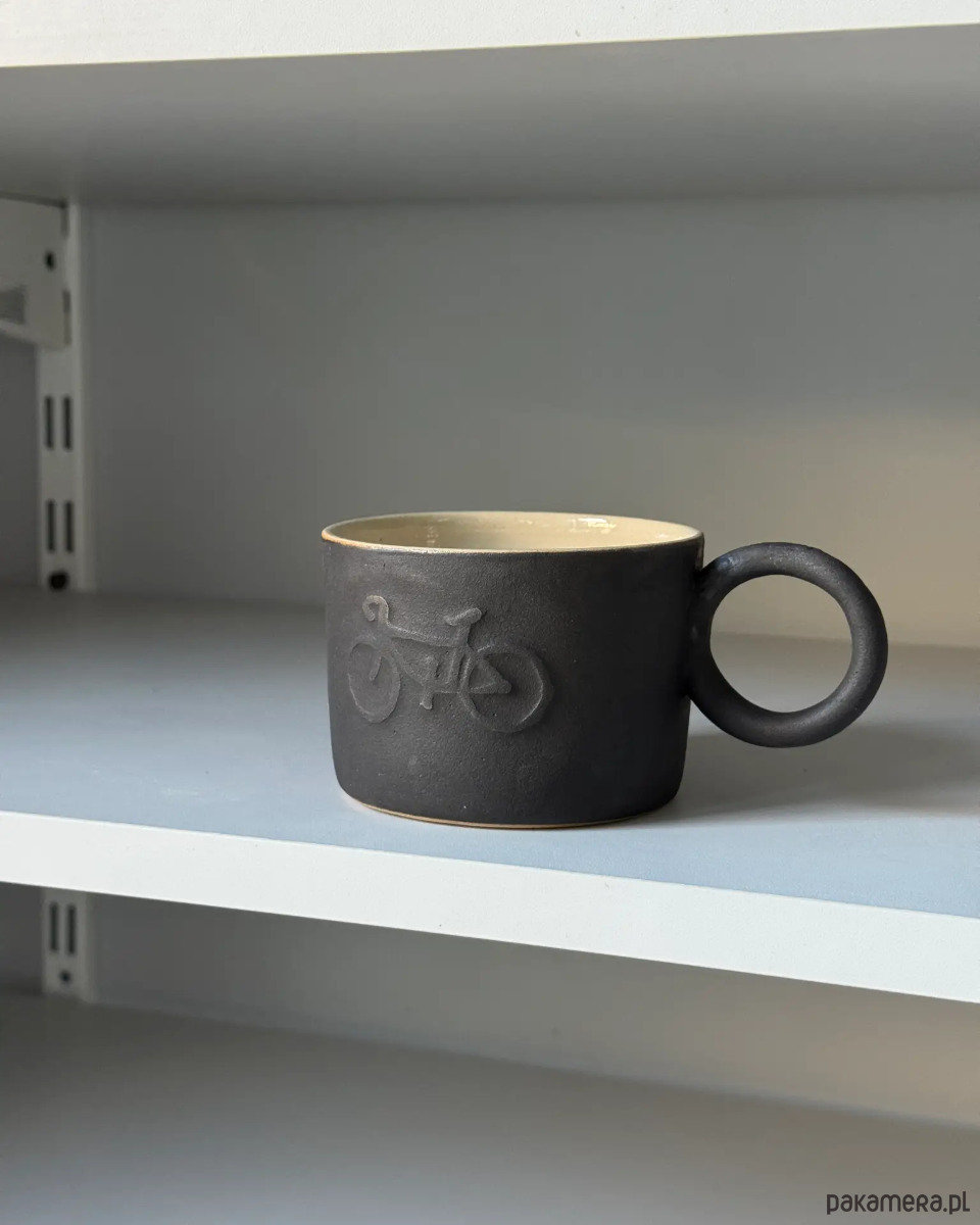 Ceramiczny Kubek z Uchem CR Mat Black Bike 320 ml to minimalistyczny kubek ceramiczny z uchem w eleganckim, matowym kolorze mat black, z motywem rowerka szosowego, stworzony ręcznie z wysokiej jakości ceramiki artystycznej. Każdy egzemplarz to unikalne połączenie trwałości i nowoczesnego designu. Doskonały do codziennego rytuału picia kawy czy herbaty, a także jako wyjątkowy prezent dla pasjonatów kubków handmade i ponadczasowej estetyki.