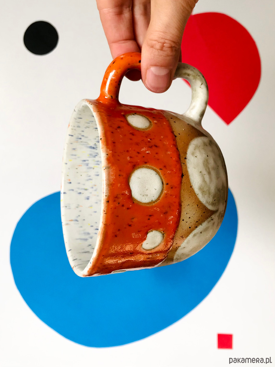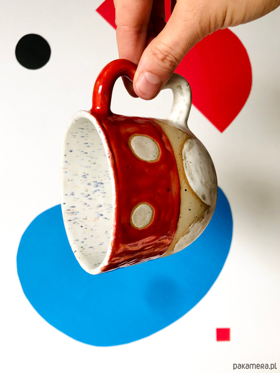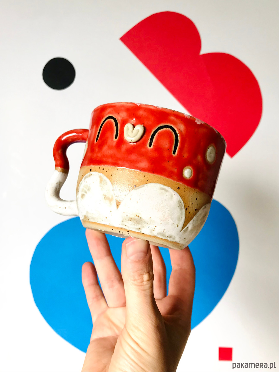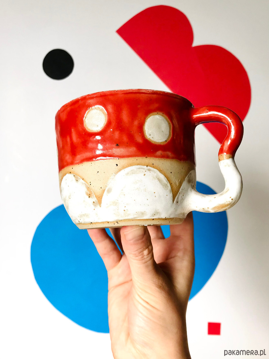 Kubek ceramiczny z uchem Muchomor, wielobarwnie szkliwiony. W środku biały. Wykonany z nakrapianej gliny.