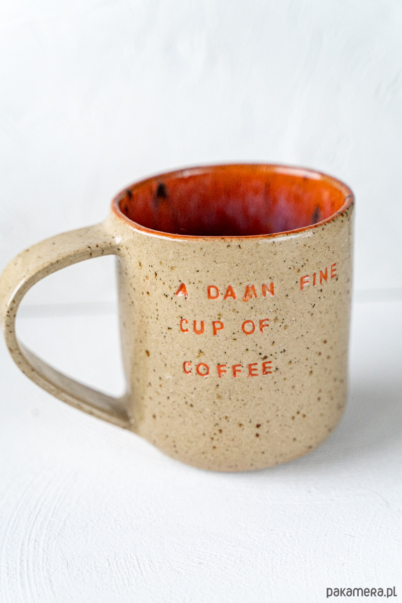Kamionkowy kubek wykonany z jasnej, nakrapianej gliny, pokryty błyszczącym szkliwem, z tłoczonym napisem.