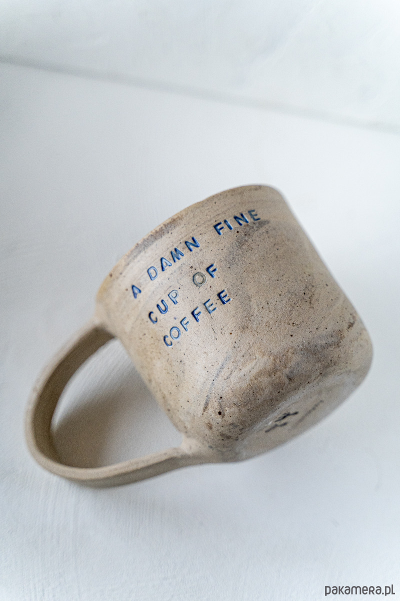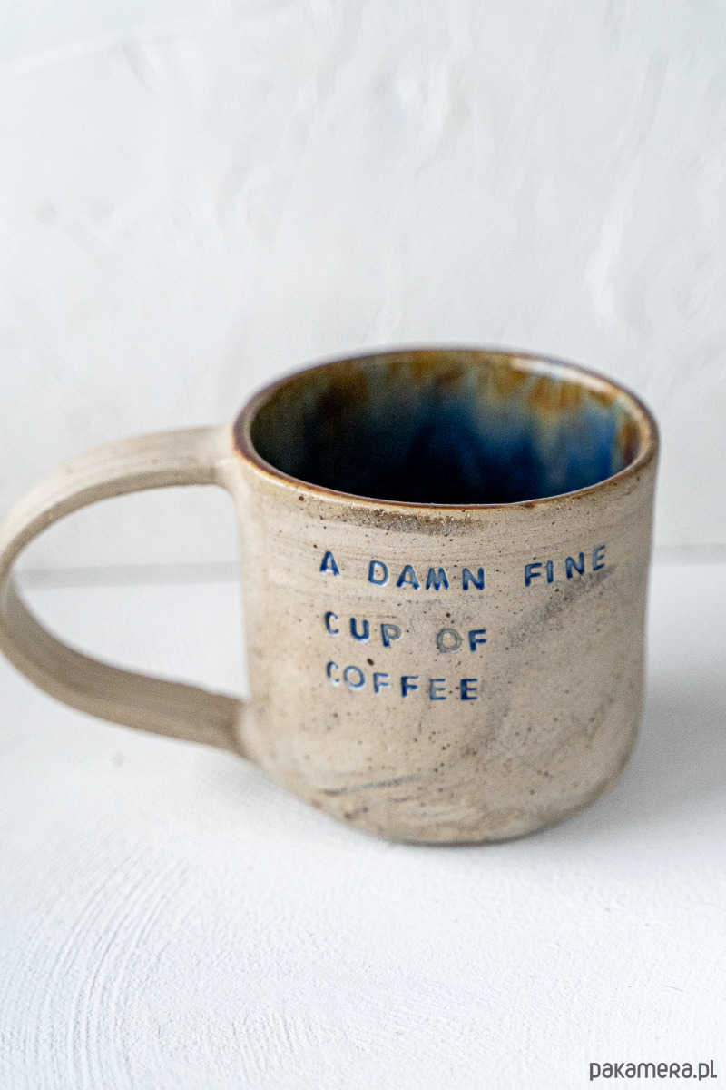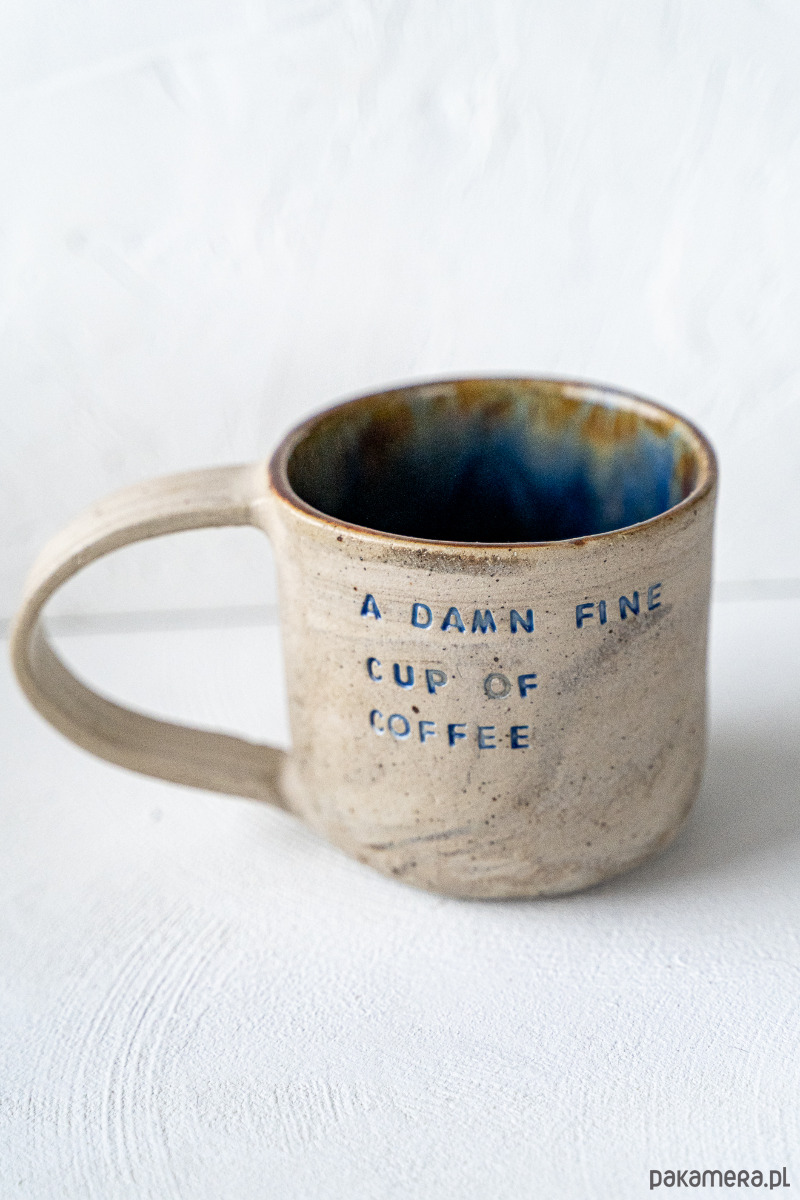 Kamionkowy kubek wykonany z mieszanki glin, pokryty błyszczącym szkliwem, z tłoczonym napisem.