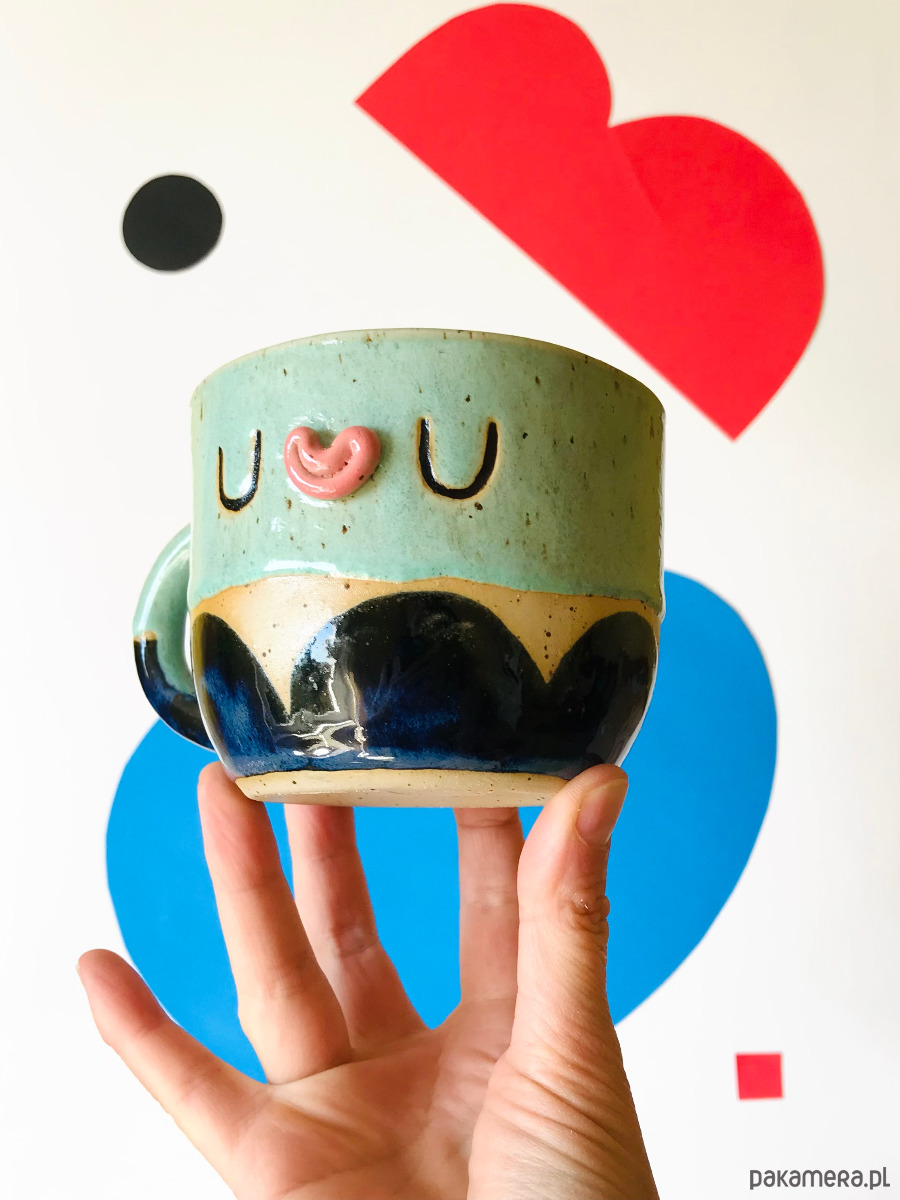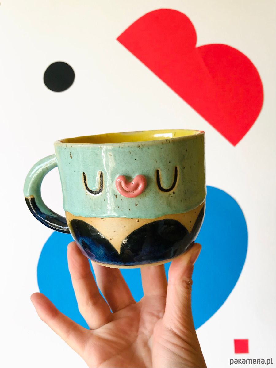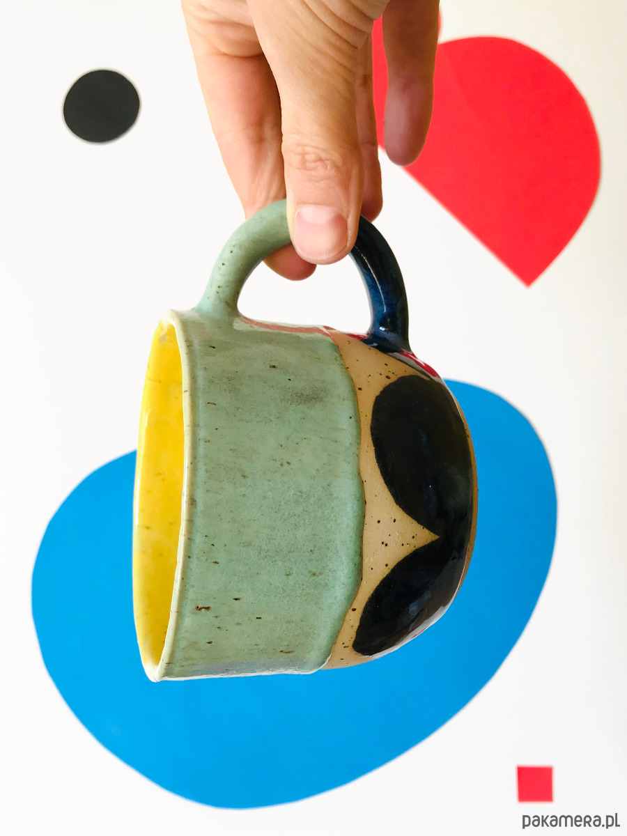 Kubek ceramiczny z uchem Uśmiech, wielobarwnie szkliwiony. W środku zółty. Wykonany z nakrapianej gliny.