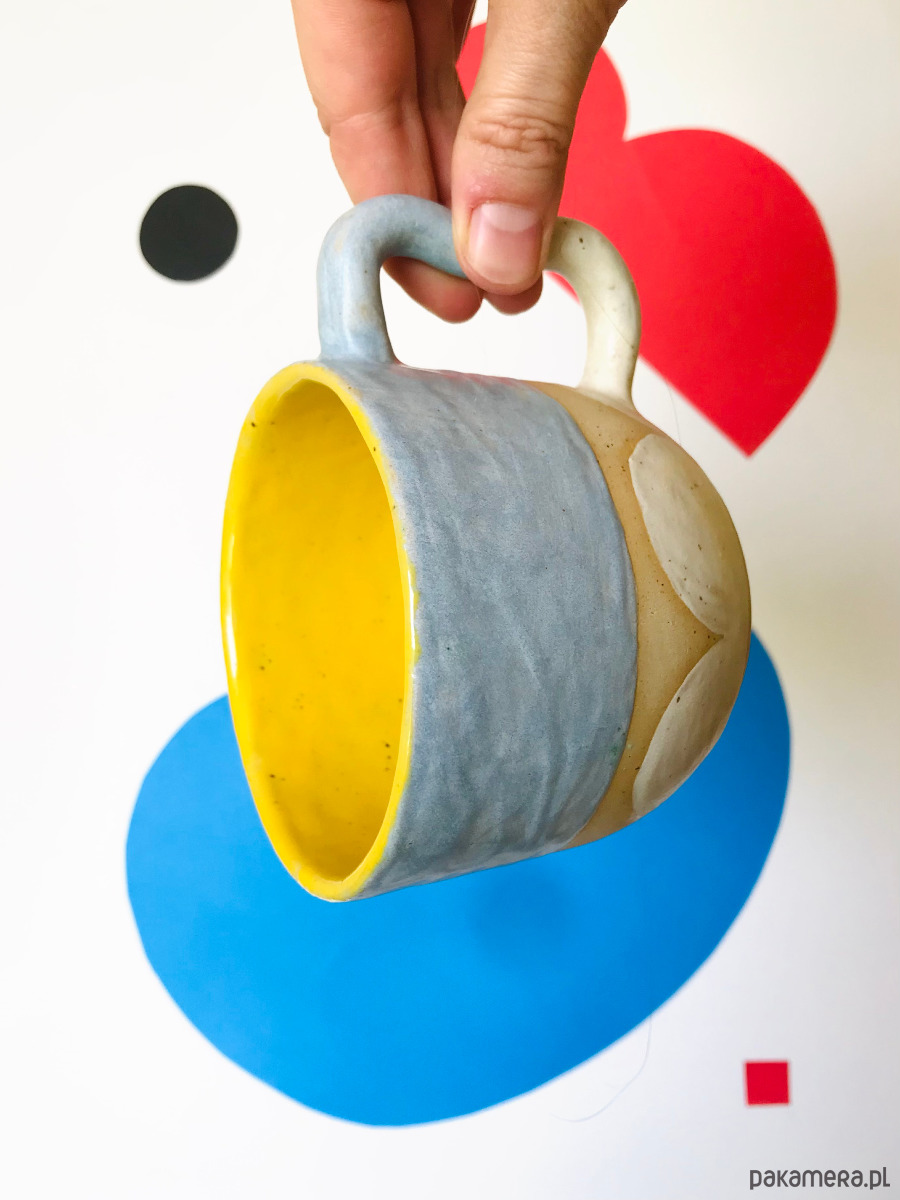 Kubek ceramiczny z uchem Uśmiech, wielobarwnie szkliwiony. W środku żółty. Wykonany z nakrapianej gliny.