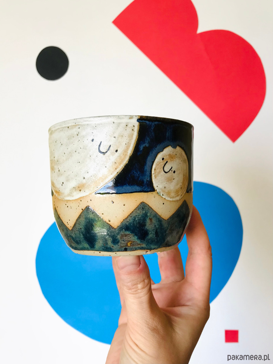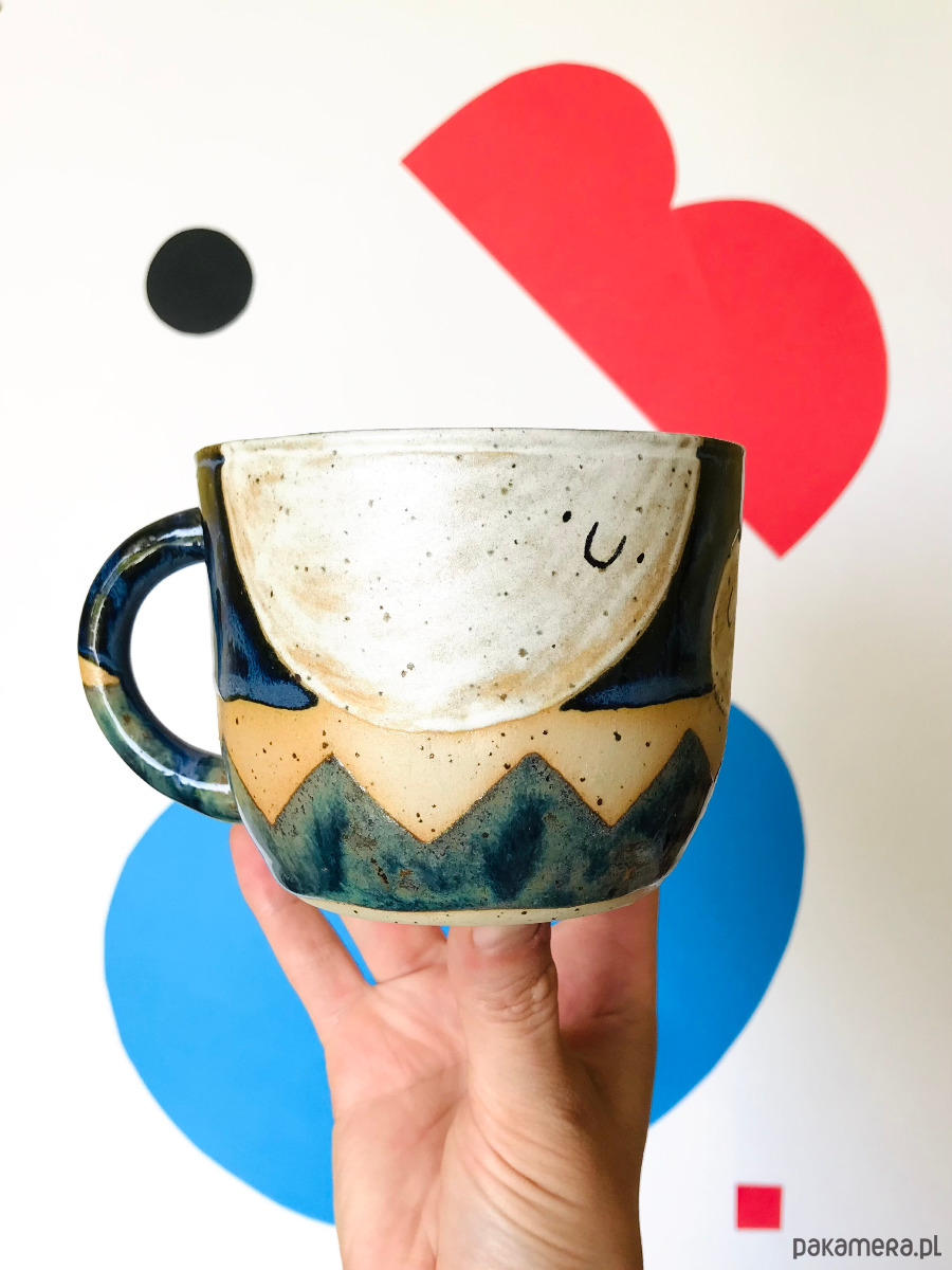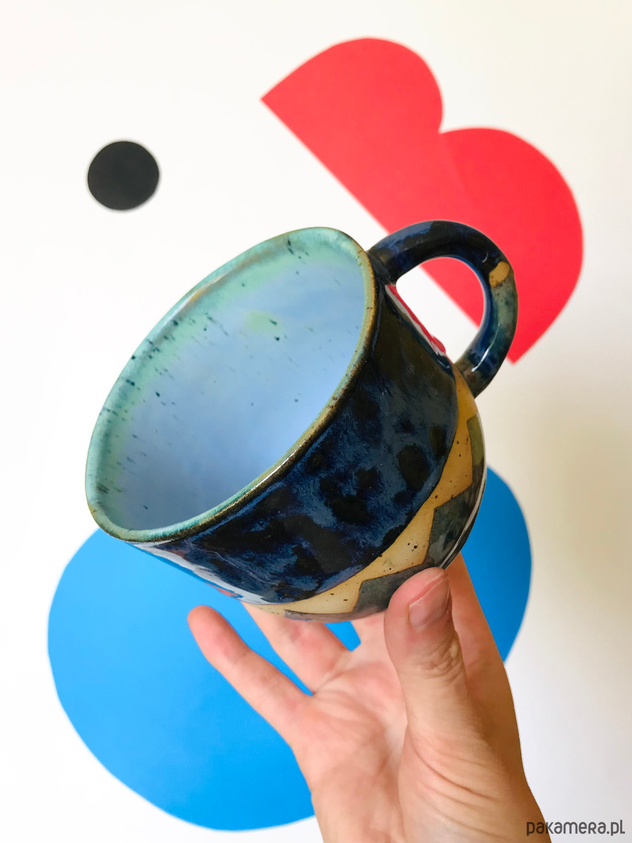 Kubek ceramiczny z uchem Planety, wielobarwnie szkliwiony. W środku błękitny. Wykonany z nakrapianej gliny.