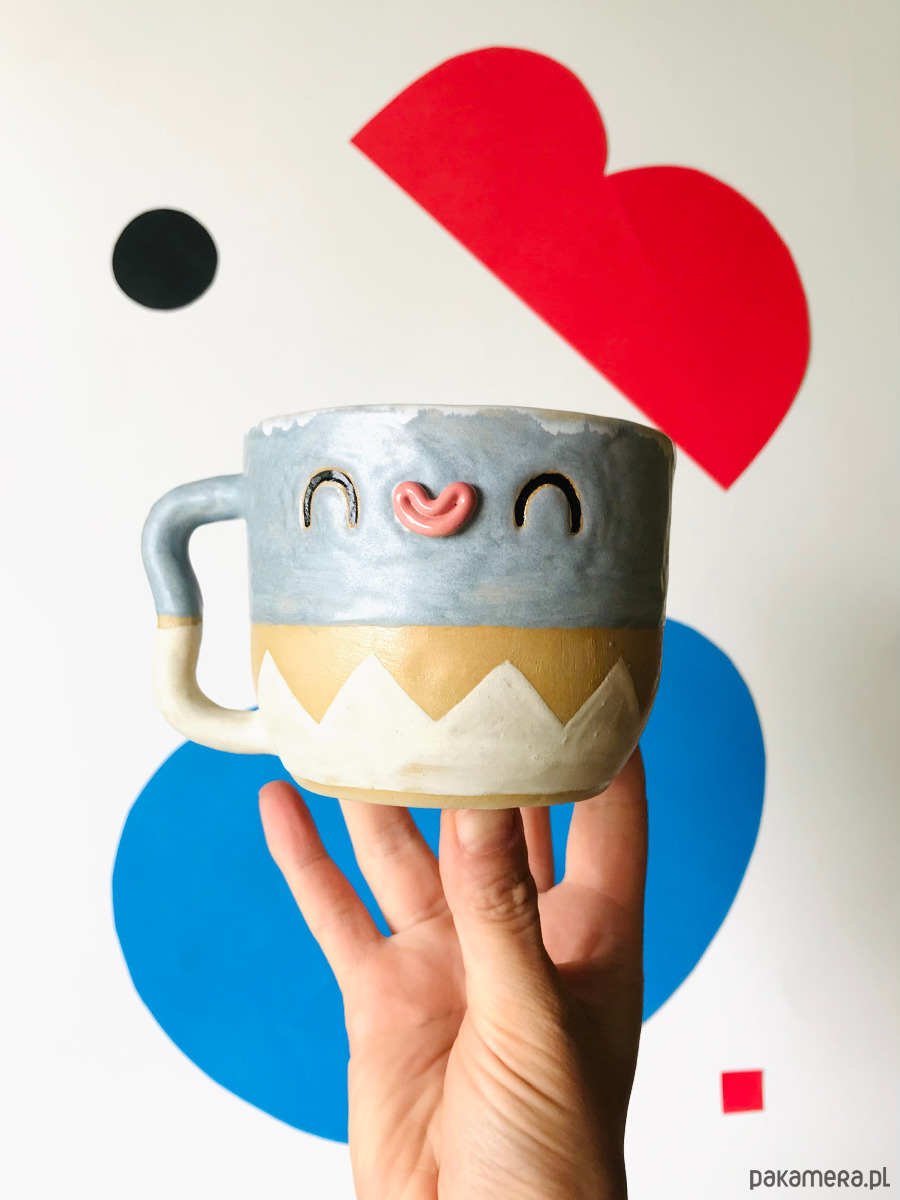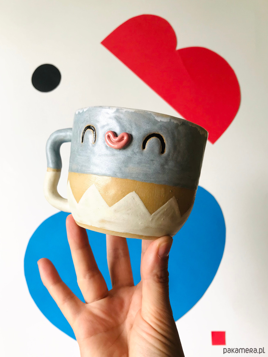 Kubek ceramiczny z uchem Uśmiech, wielobarwnie szkliwiony. W środku biały. Wykonany z nakrapianej gliny.