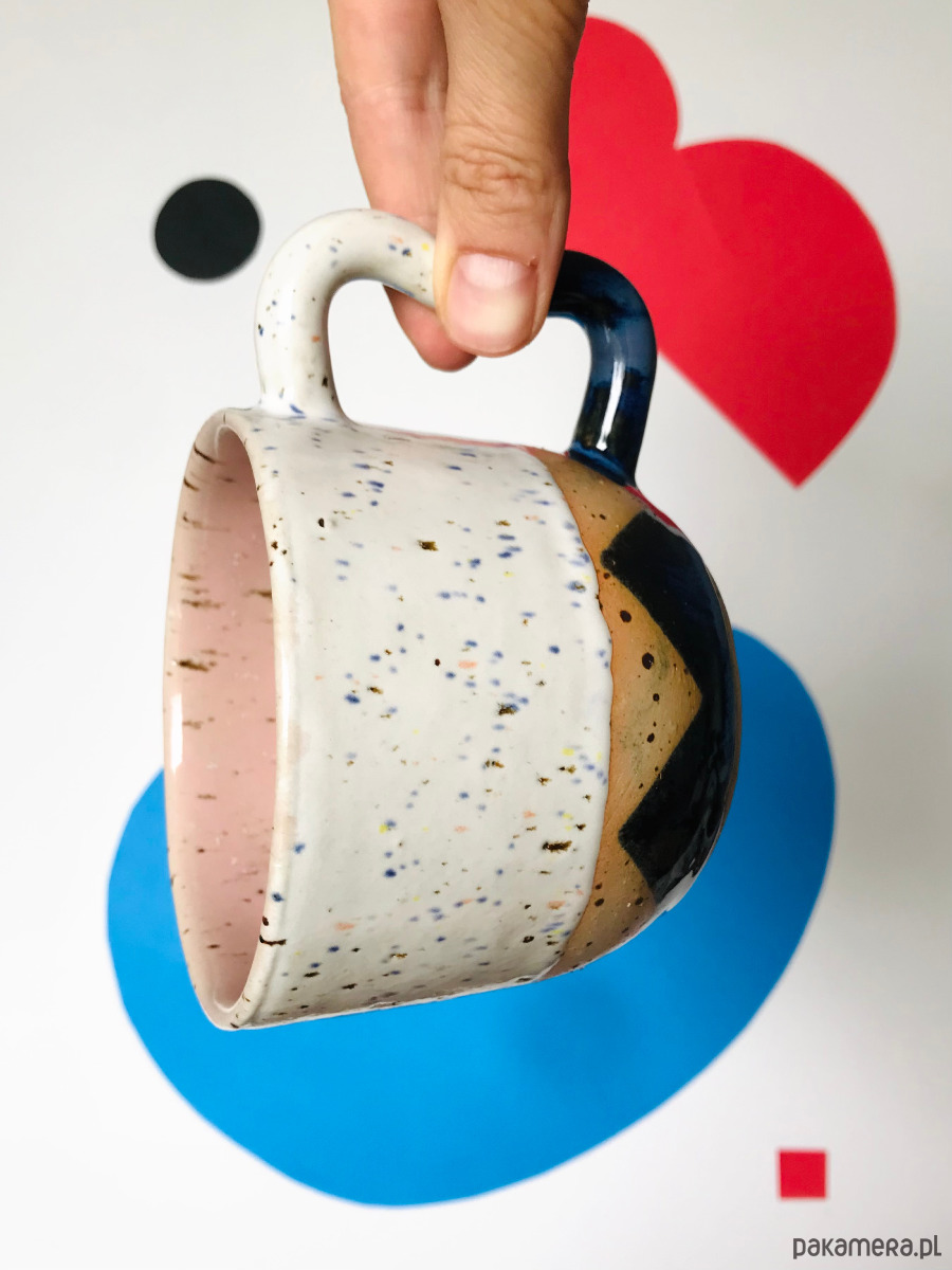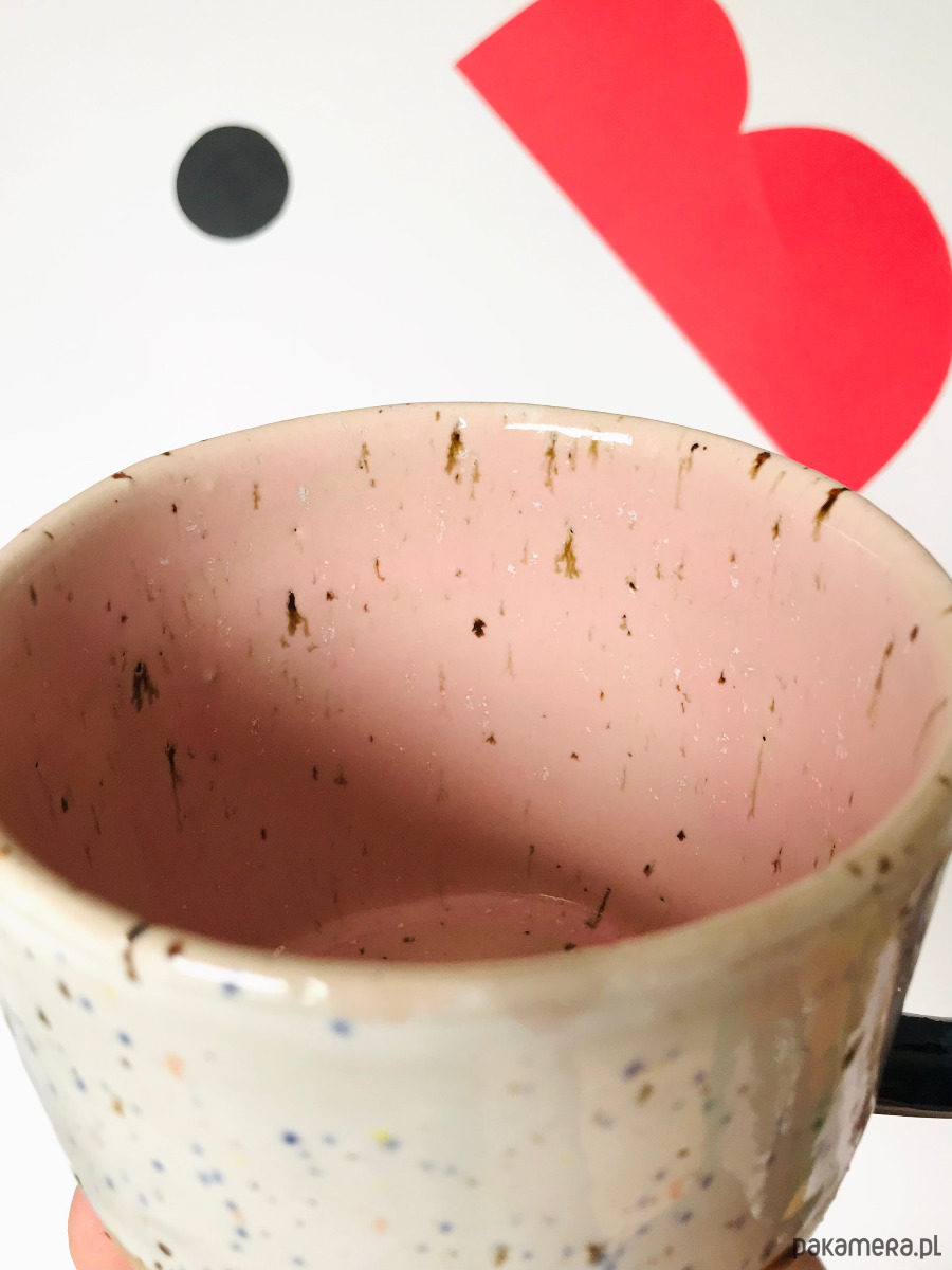 Kubek ceramiczny z uchem Uśmiech, wielobarwnie szkliwiony. W środku różowy. Wykonany z nakrapianej gliny.
