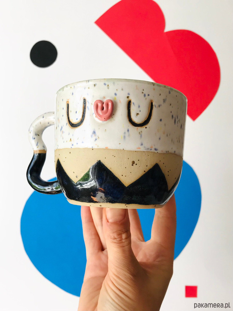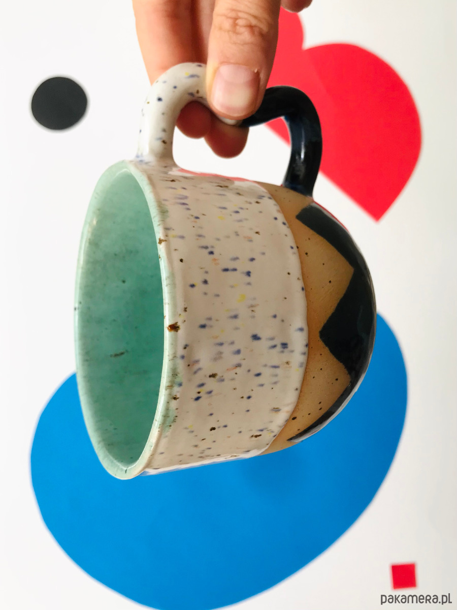 Kubek ceramiczny z uchem Uśmiech, wielobarwnie szkliwiony. W środku seledynowy. Wykonany z nakrapianej gliny.