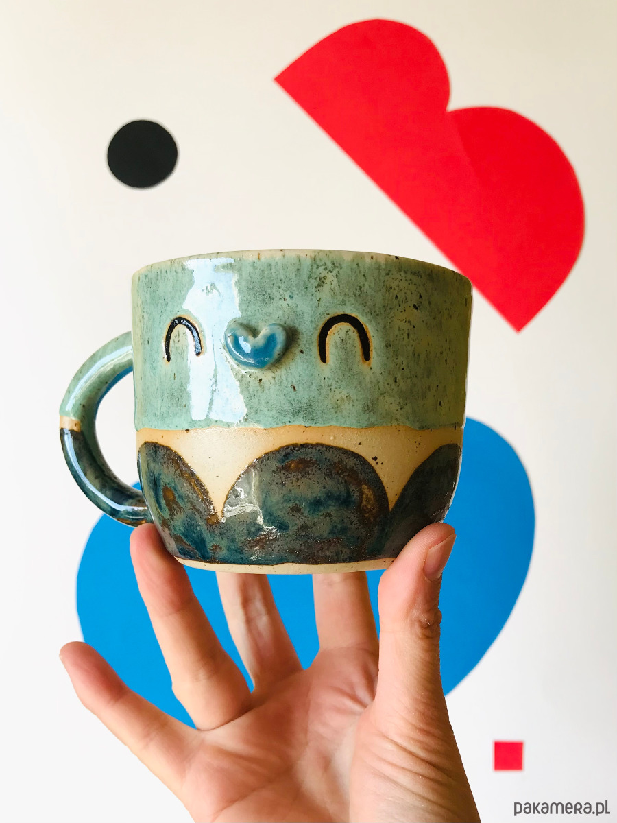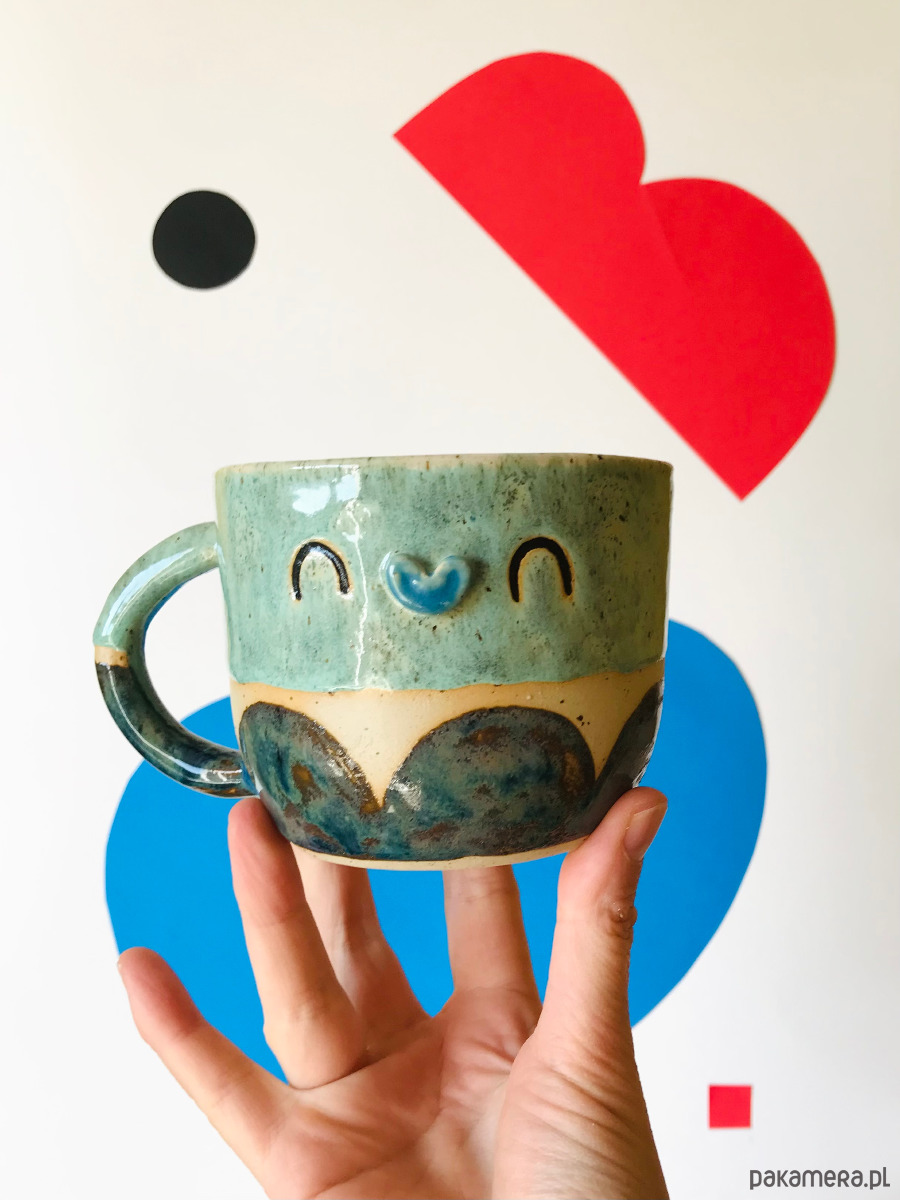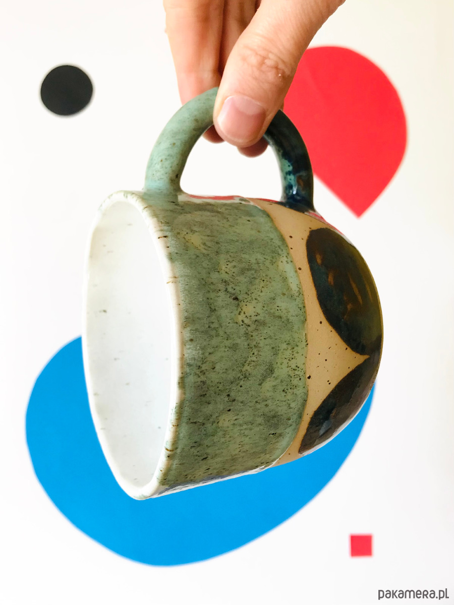 Kubek ceramiczny z uchem Uśmiech, wielobarwnie szkliwiony. W środku biały. Wykonany z nakrapianej gliny.