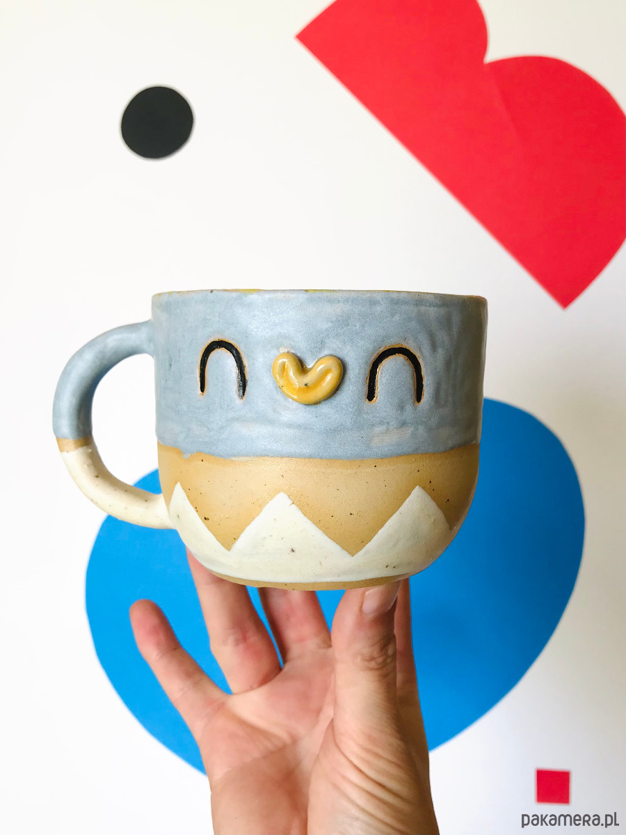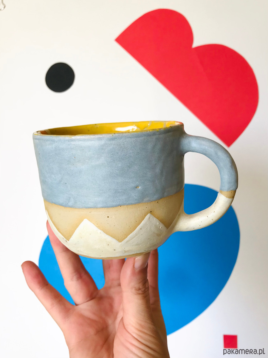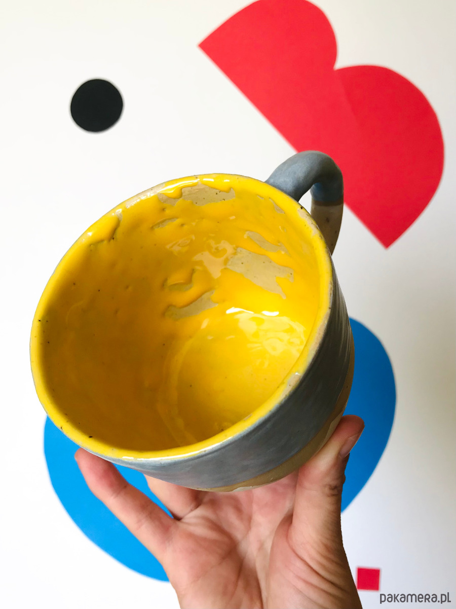 Kubek ceramiczny z uchem Uśmiech, wielobarwnie szkliwiony. W środku żółty. Wykonany z nakrapianej gliny.