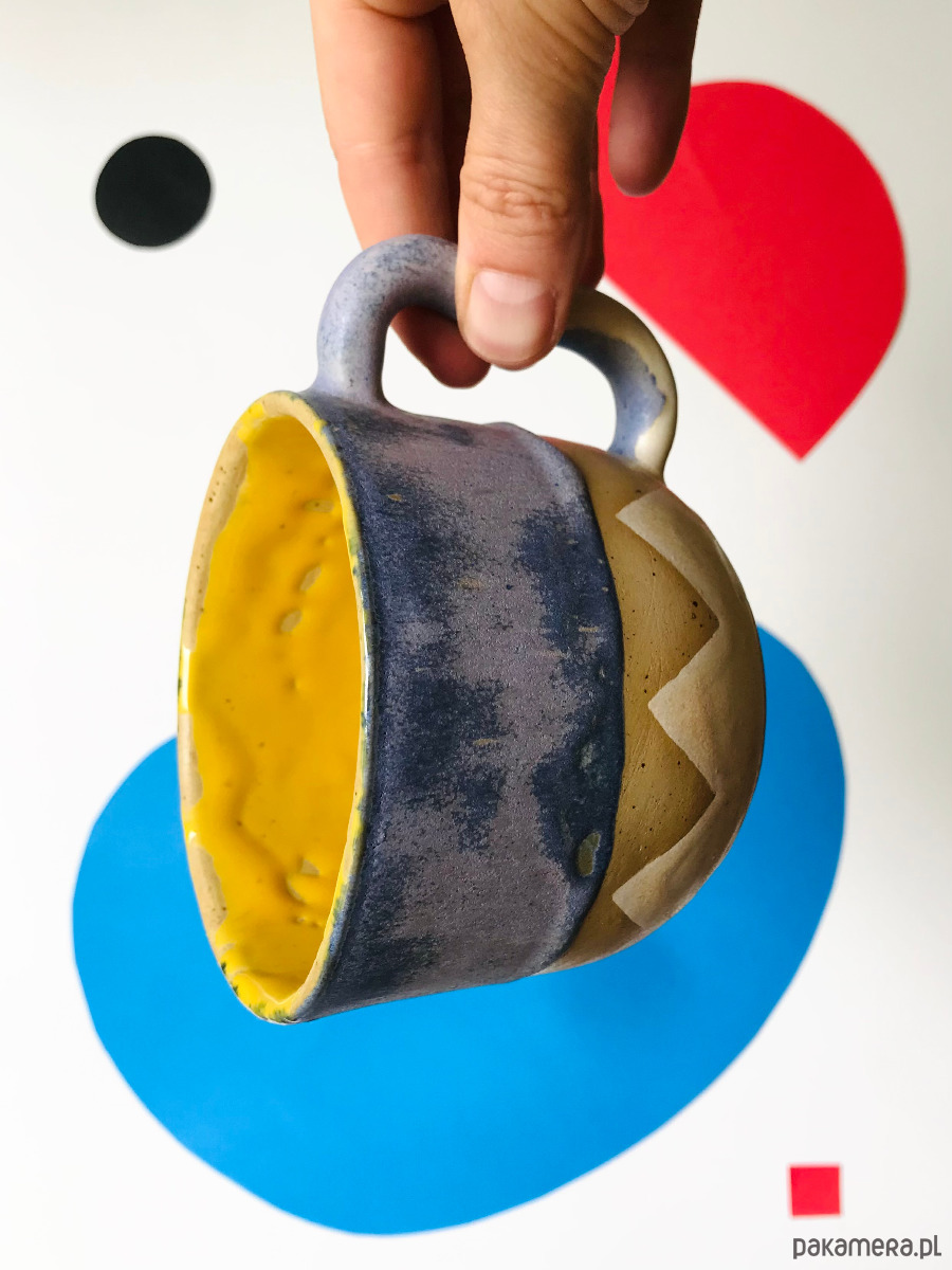 Kubek ceramiczny z uchem Uśmiech, wielobarwnie szkliwiony. W środku żółty. Wykonany z nakrapianej gliny.