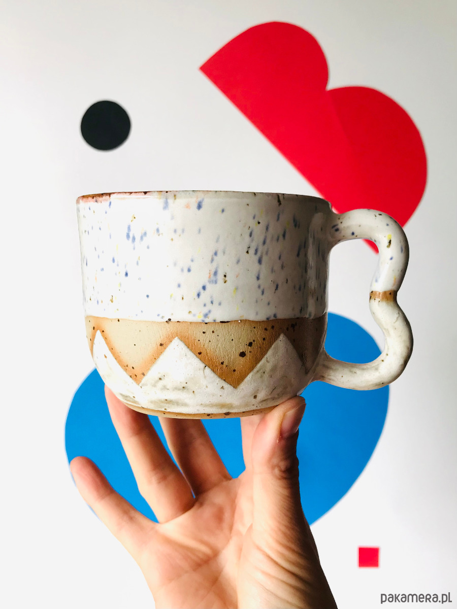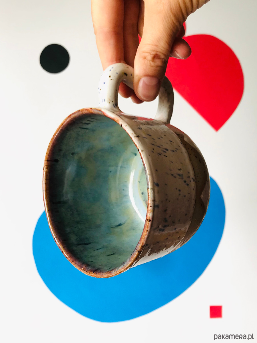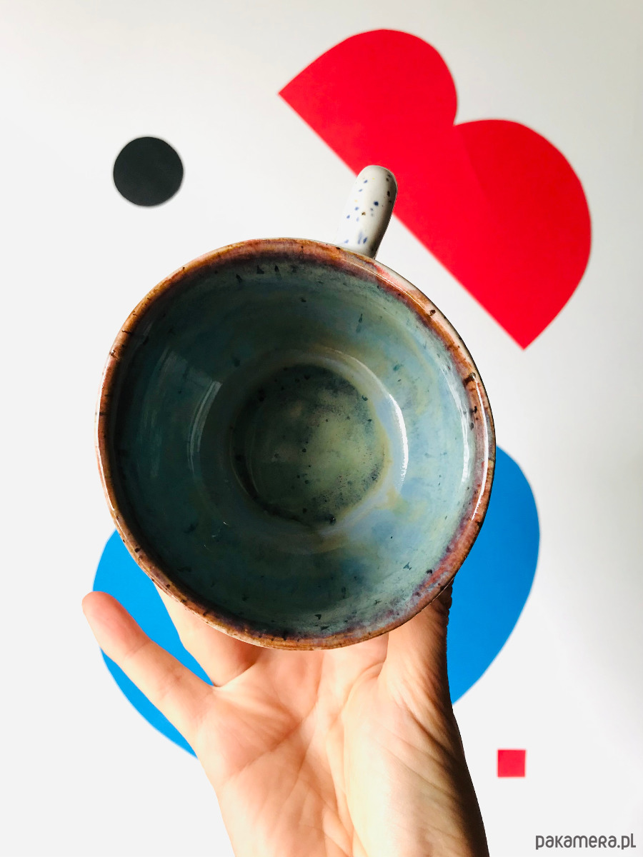 Kubek ceramiczny z uchem Uśmiech, wielobarwnie szkliwiony. W środku błękitno-fioletowy. Wykonany z nakrapianej gliny.