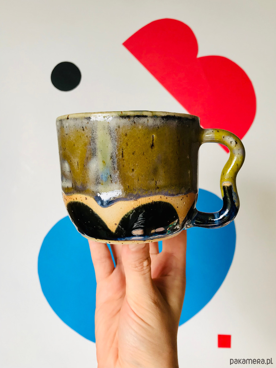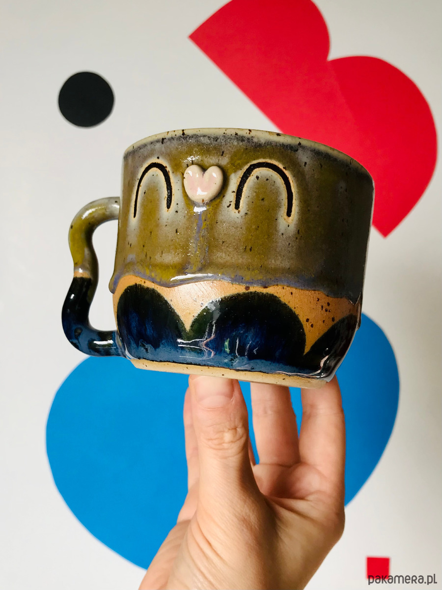 Kubek ceramiczny z uchem Uśmiech, wielobarwnie szkliwiony. W środku niebieski. Wykonany z nakrapianej gliny.