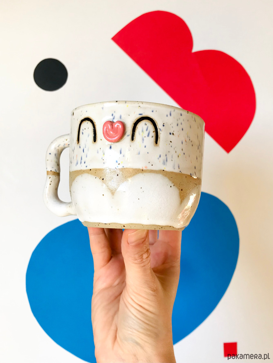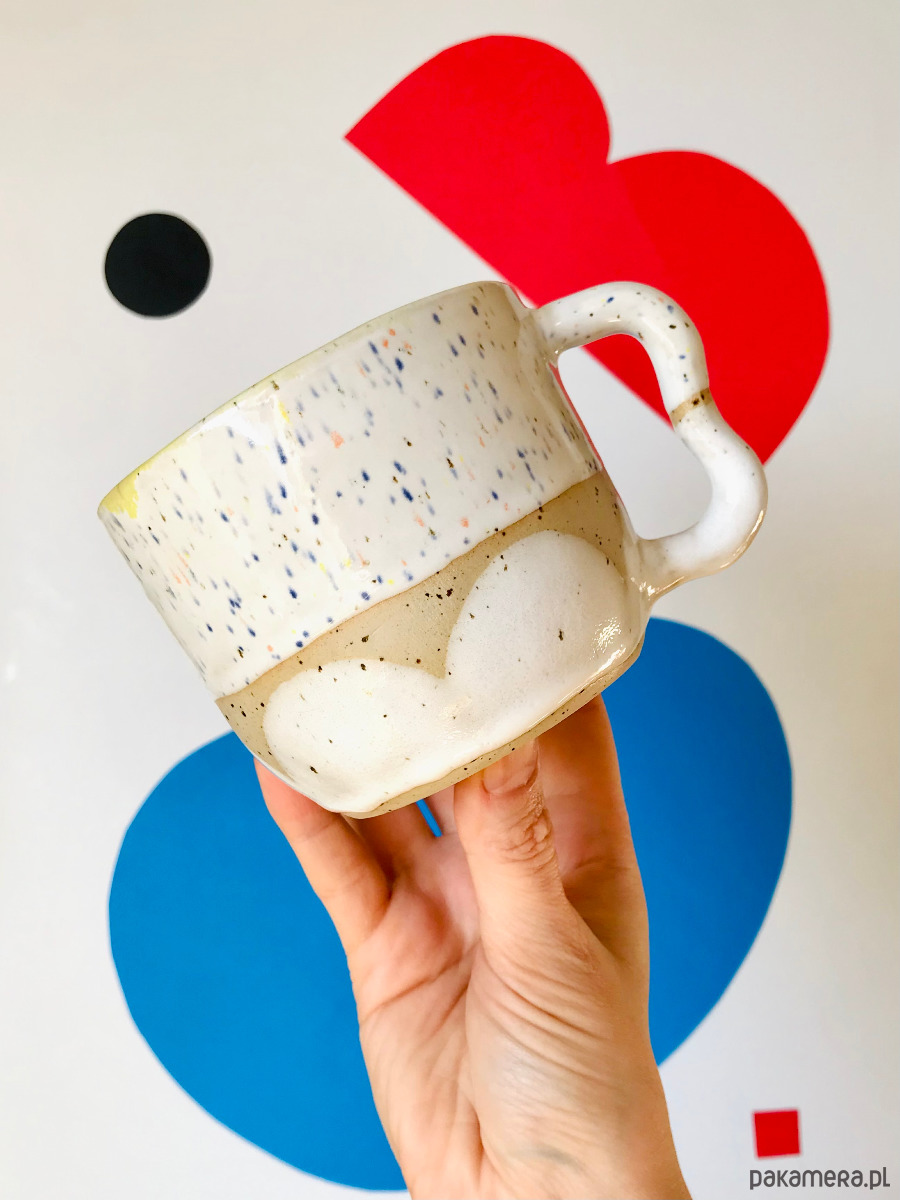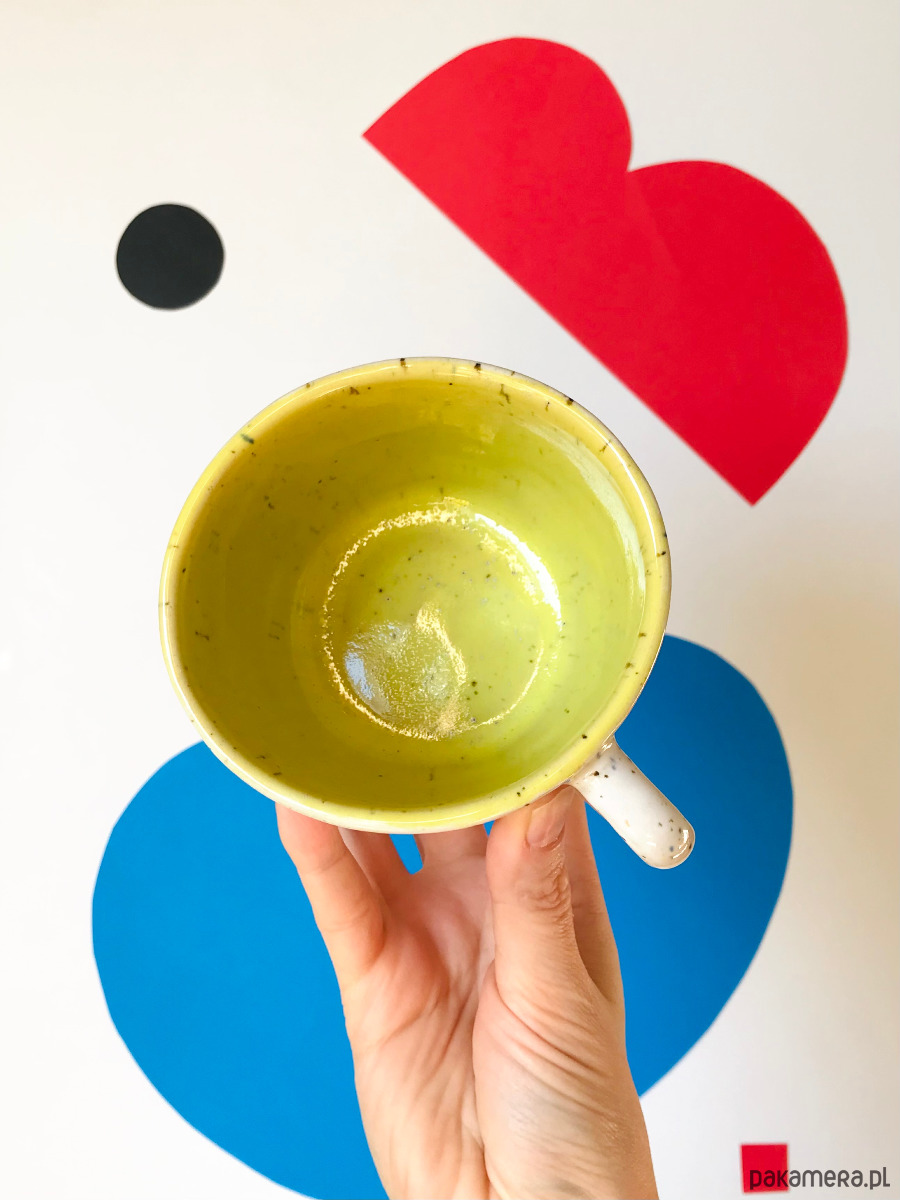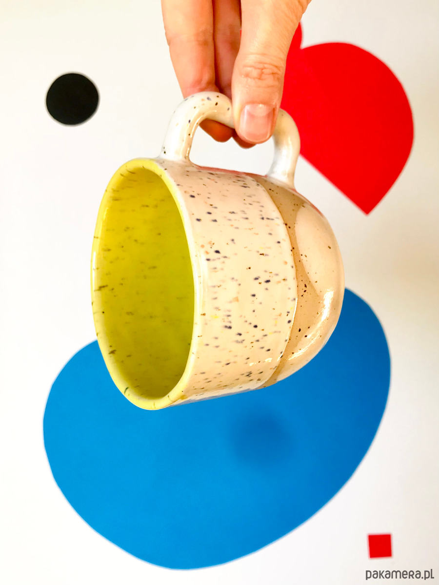 Kubek ceramiczny z uchem Uśmiech, wielobarwnie szkliwiony. W środku żółty. Wykonany z nakrapianej gliny.