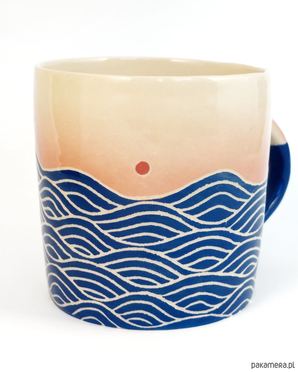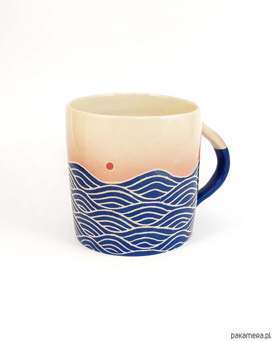 Kubek z namalowanym morzem z zachodzącym słońcem.