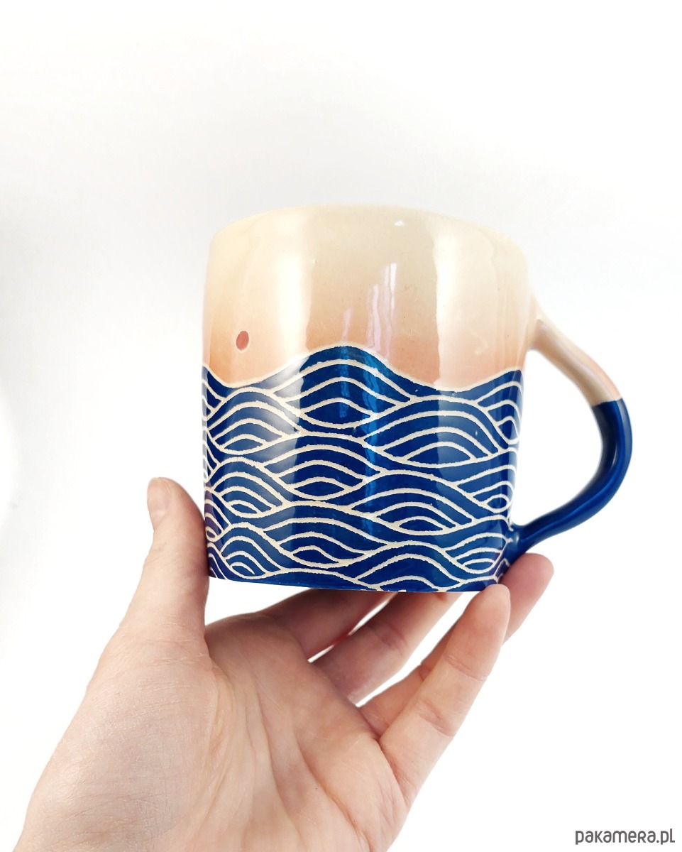 Kubeczek został ulepiony i ozdobiony ręcznie, dlatego posiada delikatnie nieregularny kształt, który nadaje mu unikatowy charakter.