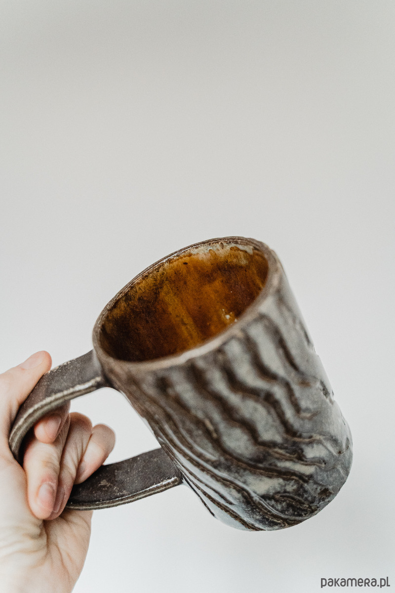 Kamionkowy kubek wykonany ręcznie z mieszanki różnokolorowych glin.