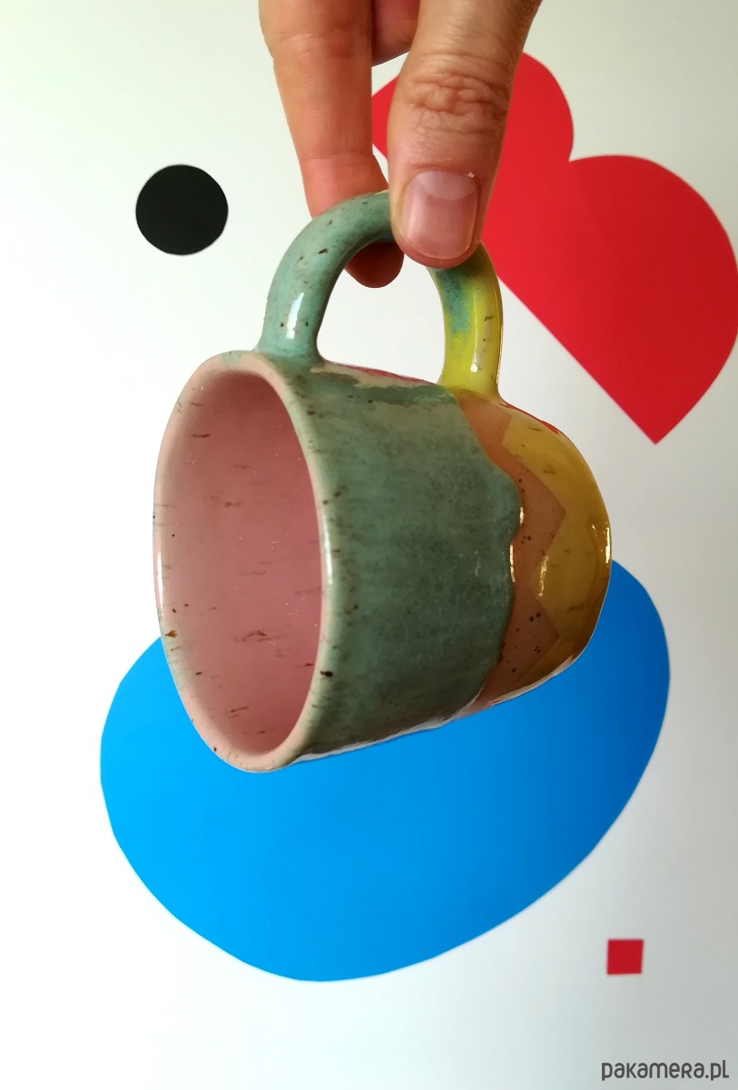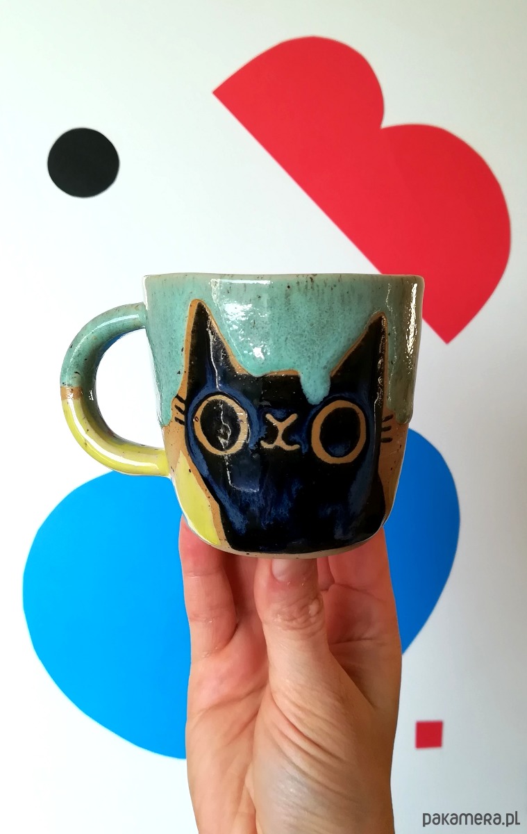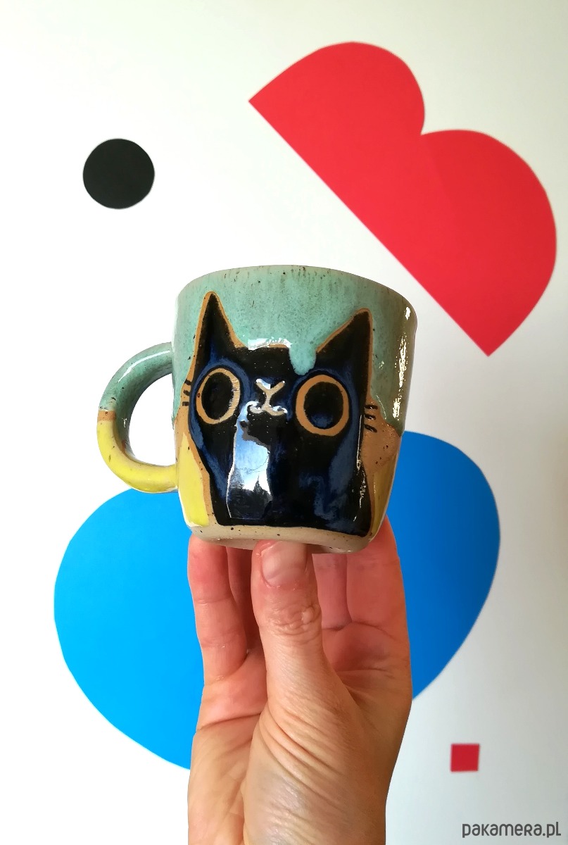 Kubek ceramiczny z ręcznie malowanym motywem kota. Wnętrze kubka jest różowe. Stworzony, by umilić Ci każdy dzień.