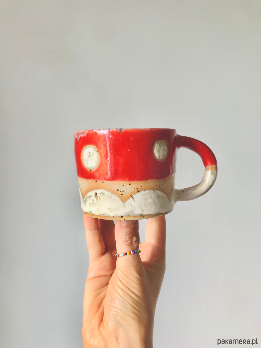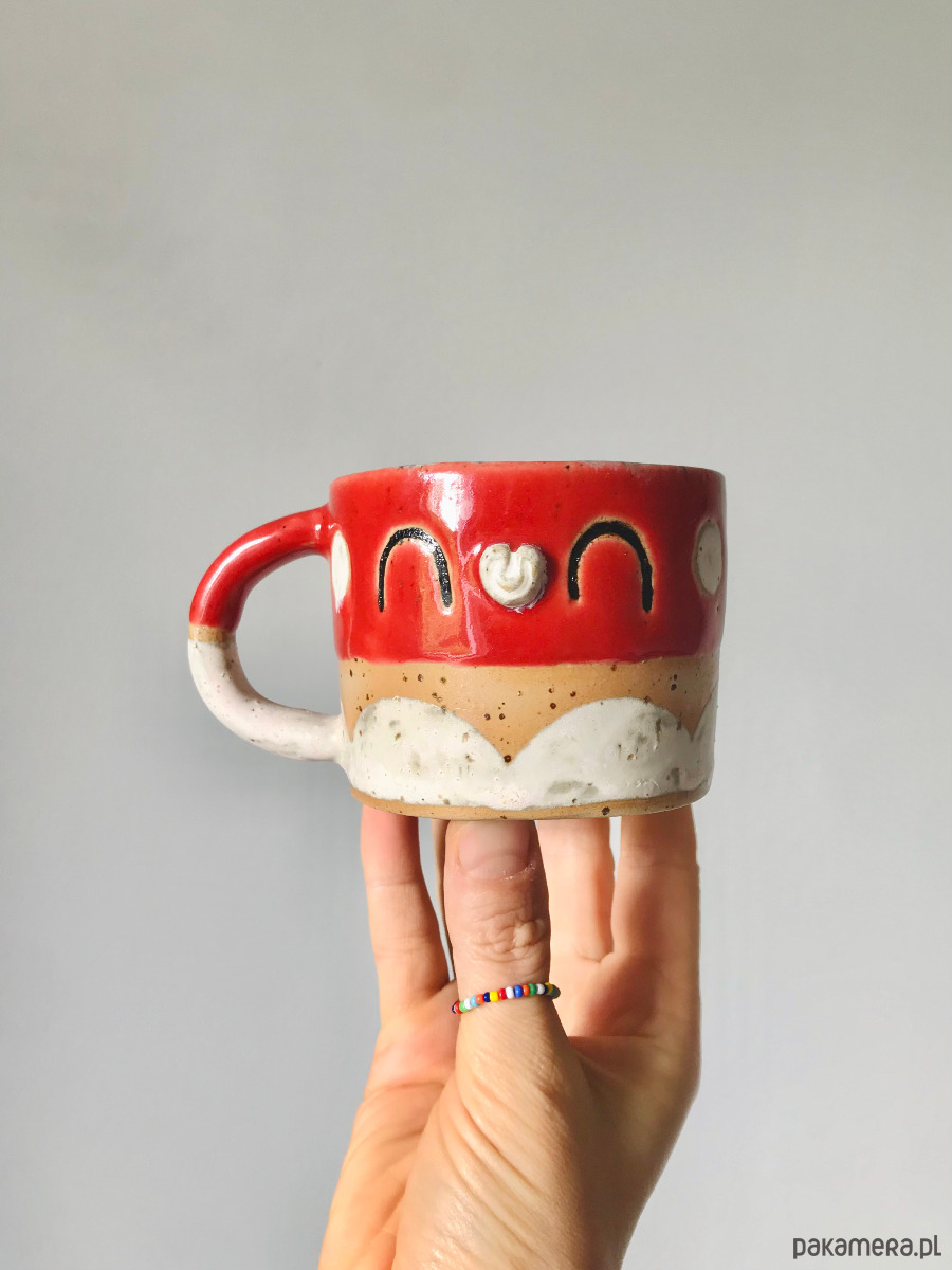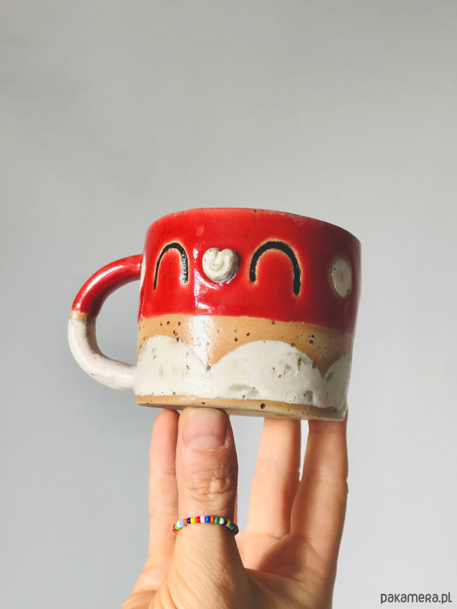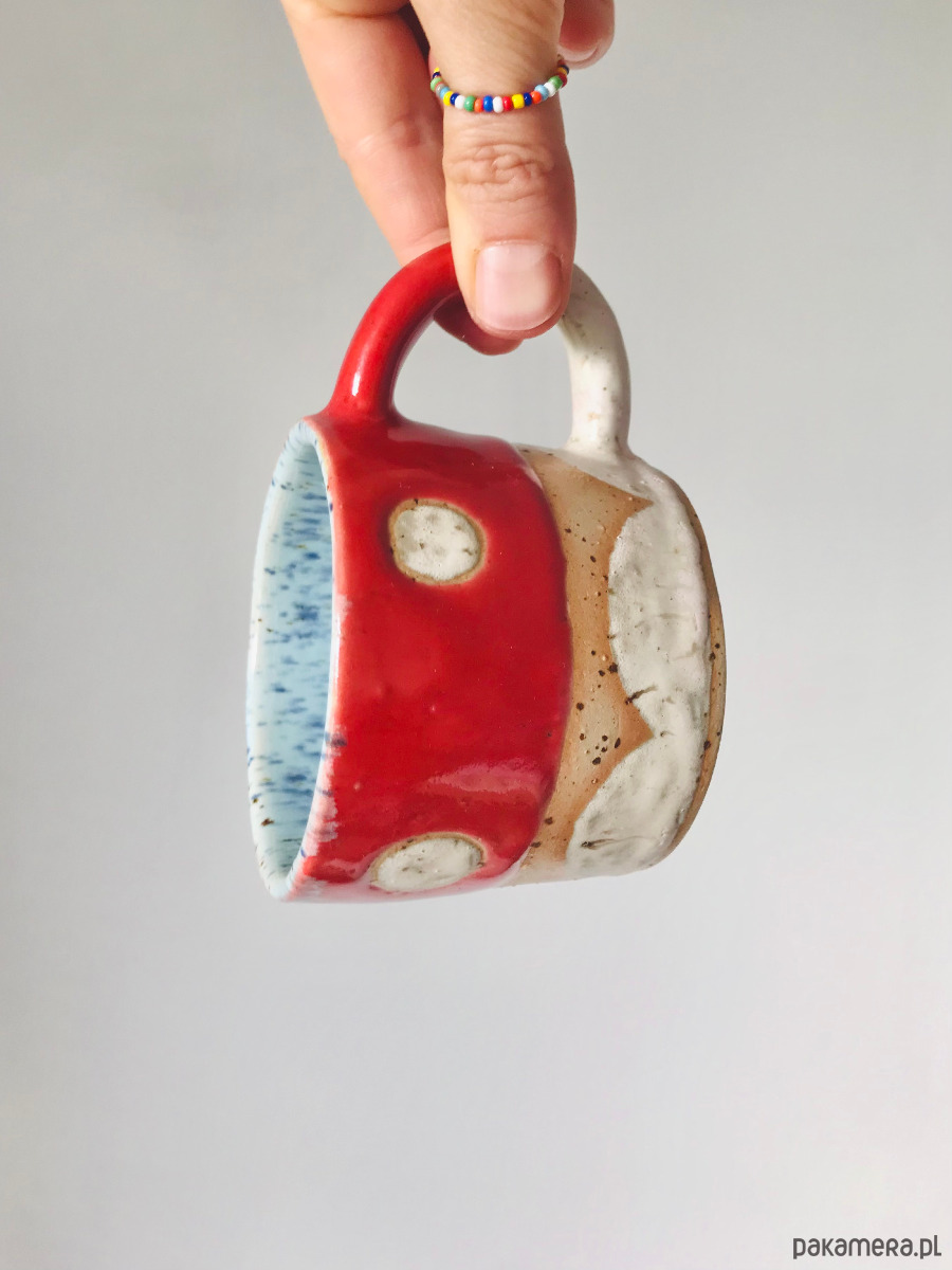 Kubek ceramiczny z uśmiechem, wielobarwnie szkliwiony. W środku błękitny. Stworzony, by umilić Ci każdy dzień.