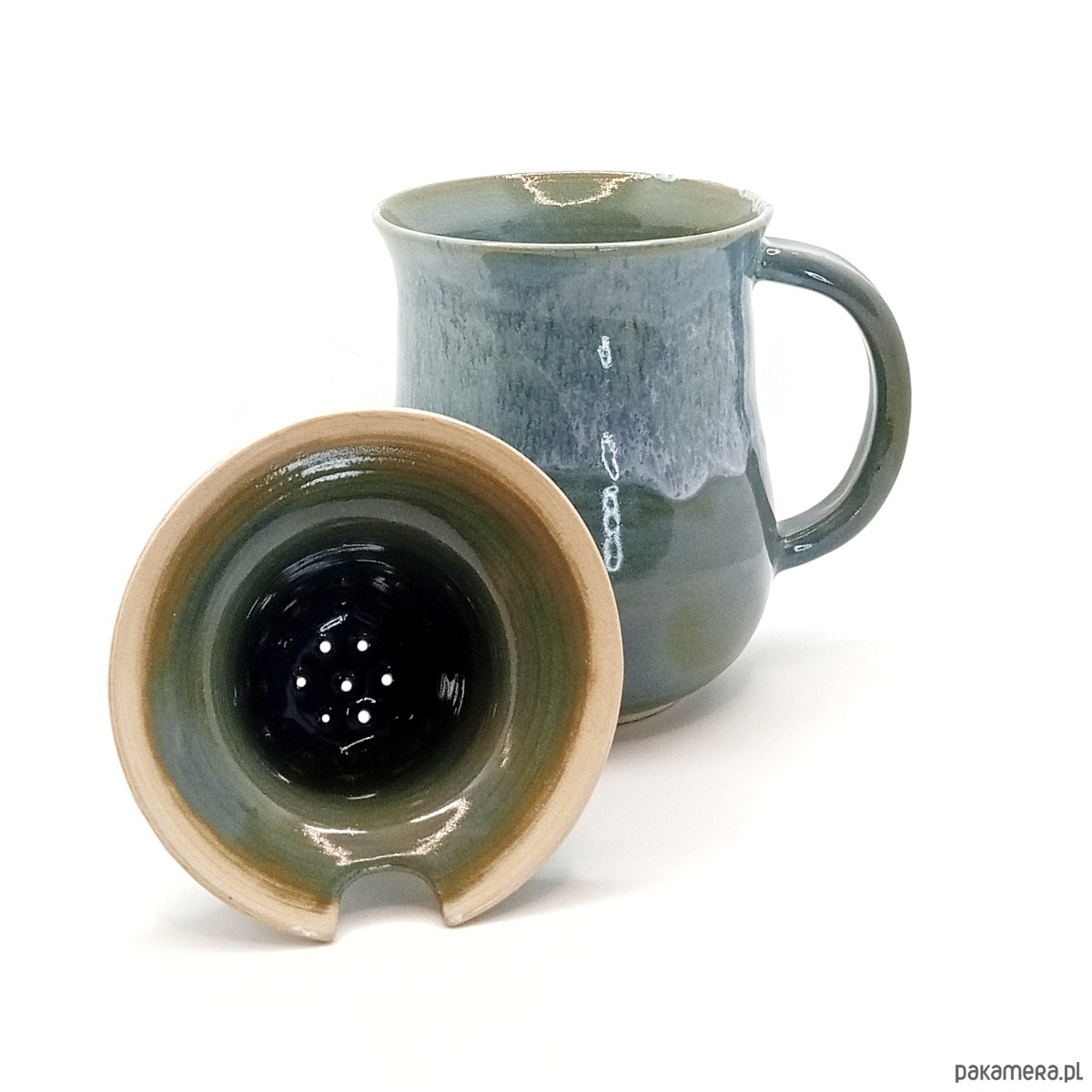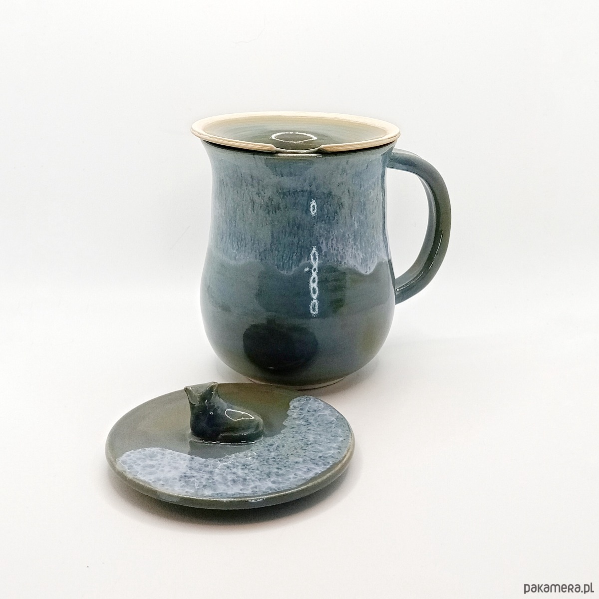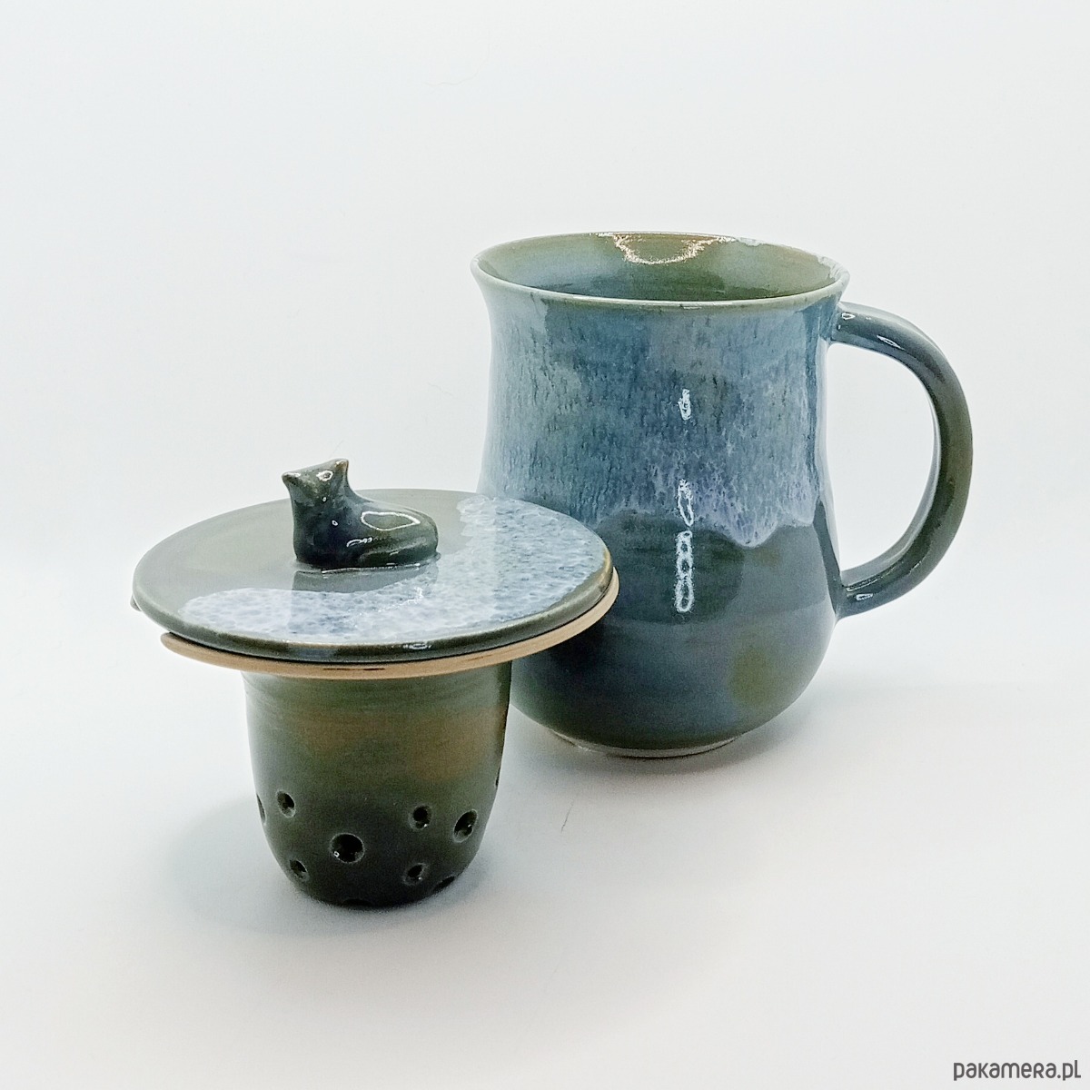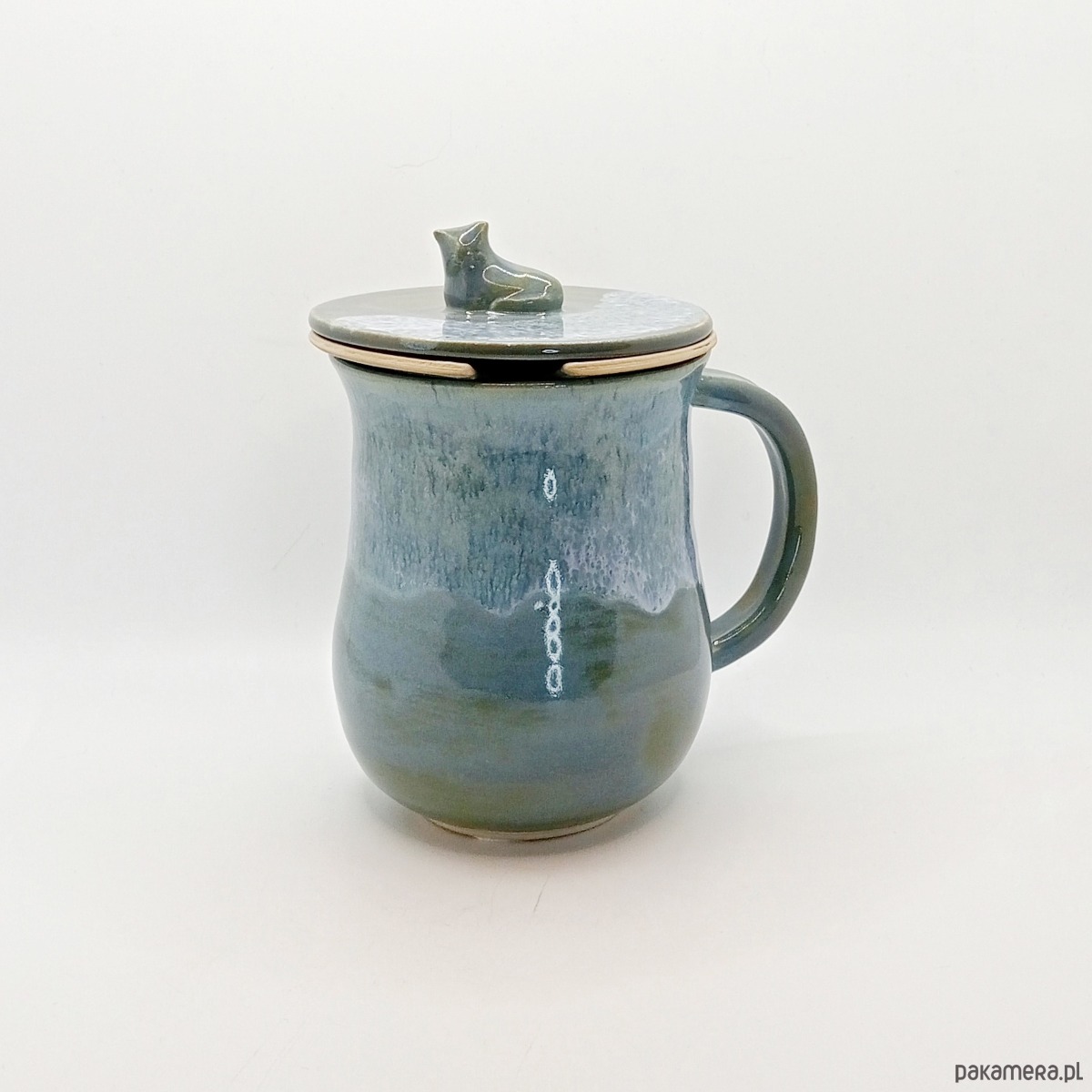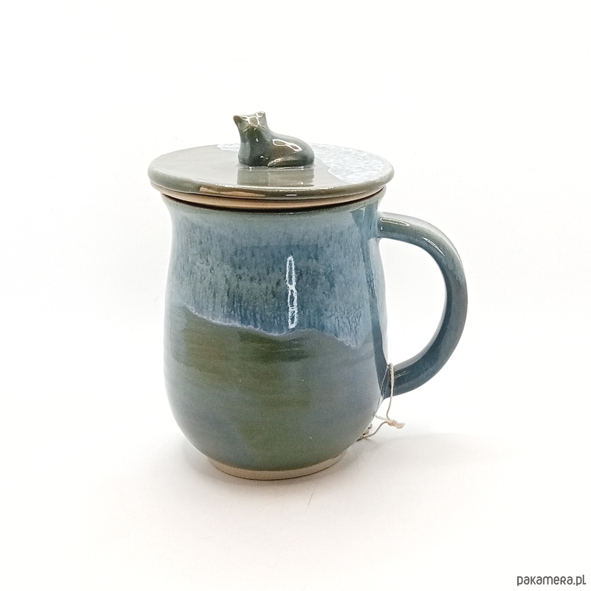 Ręcznie wykonany na kole garncarskim kubek z zaparzaczem (sitkiem) oraz pokrywką z uchwytem w kształcie kota.
