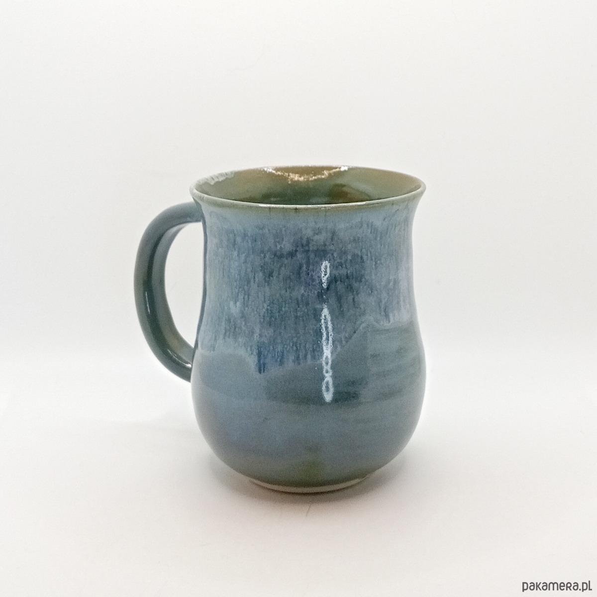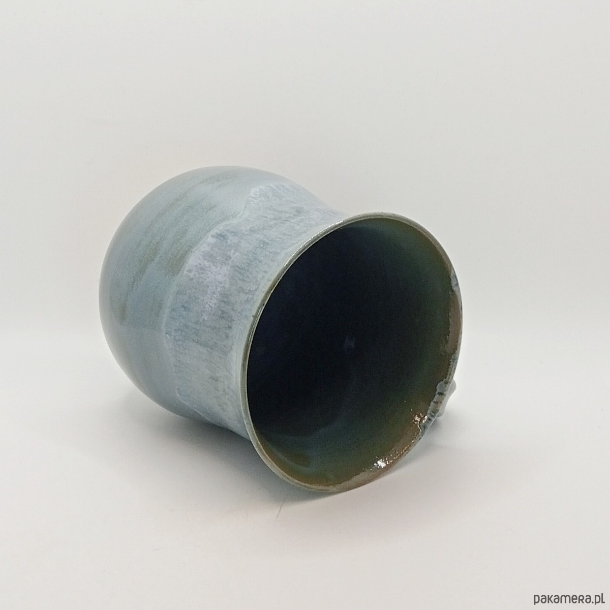 Kubek ma brzuszek i wywinięty brzeg. Wszystko szkliwione jest szkliwem jasnym, niebieskozielonym, na zewnątrz, dodatkiem dekoracyjnego szkliwa w kropeczki.