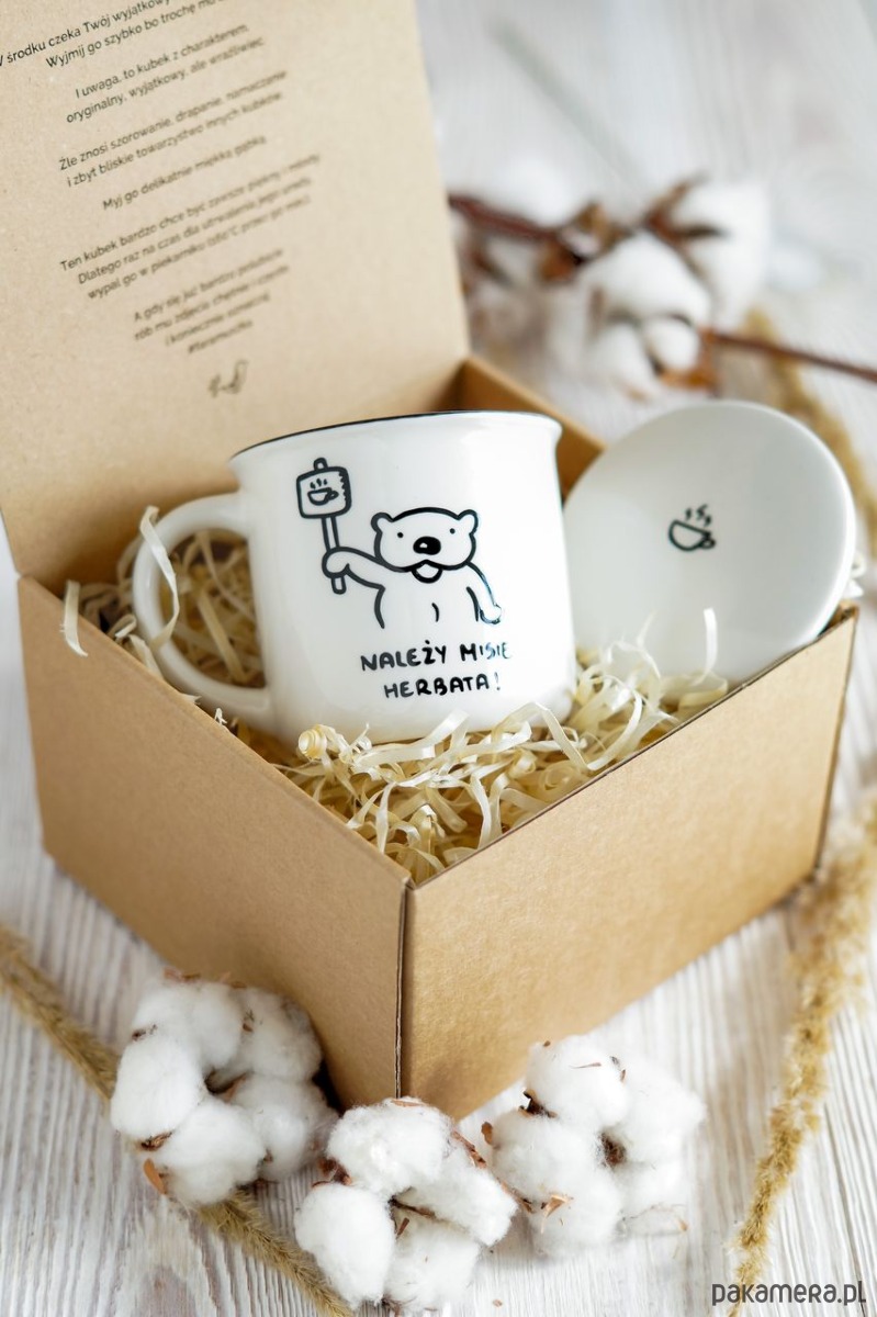 Kubek wysyłamy estetycznie zapakowany, gotowy na prezent. Do każdego dołączamy saszetkę herbaty owocowej.