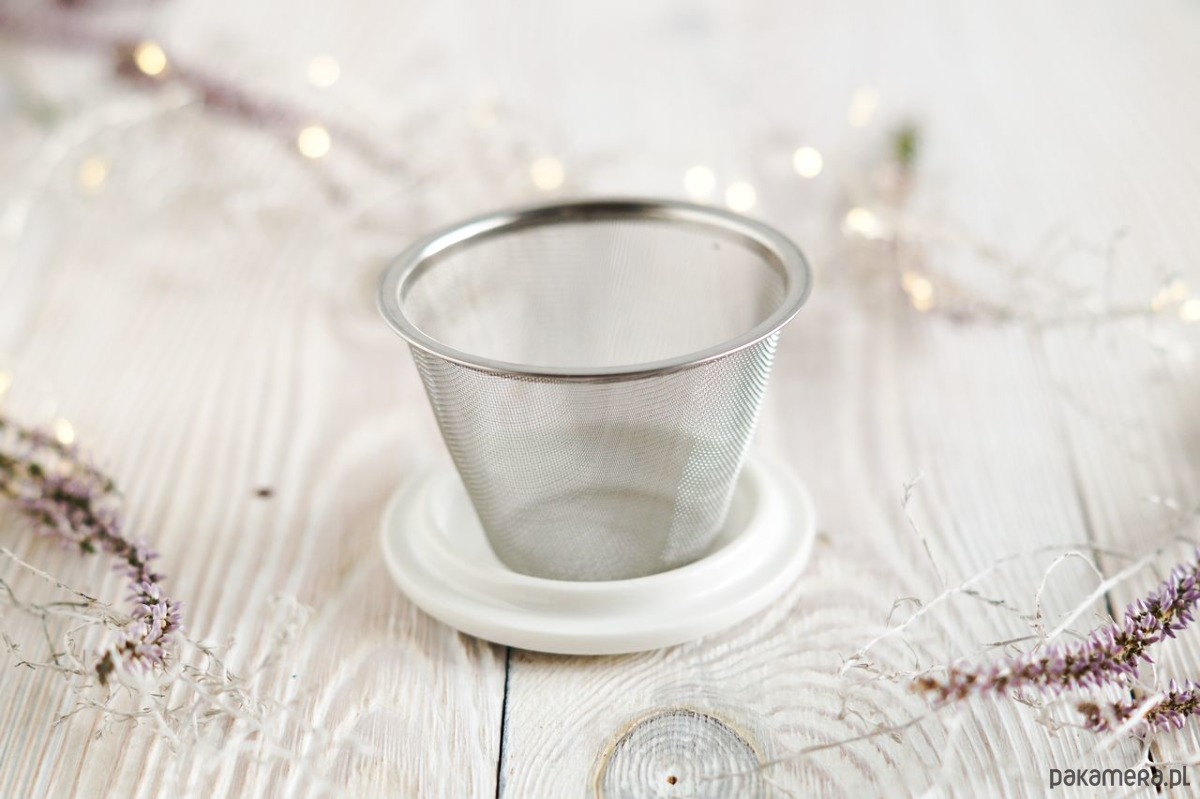 Kubek porcelanowy biały z czarnym rantem, z metalowym sitkiem i porcelanową przykrywką, wys. 8 cm, średnica 9 cm, pojemność 300 ml.