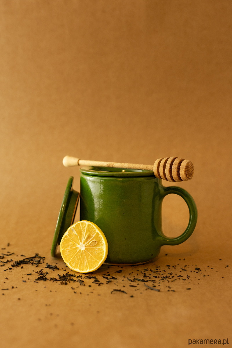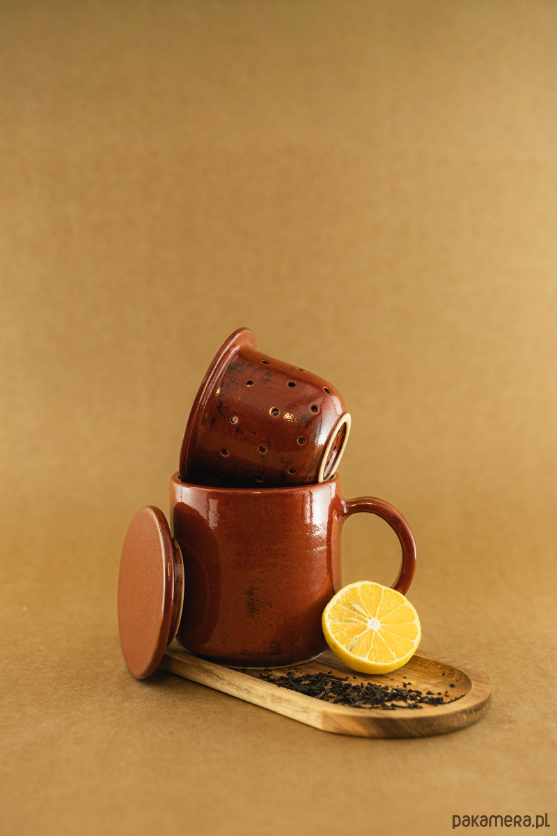W zestawie sitko i pokrywka, które idealnie pasują wymiarami do kubka i siebie nawzajem - pokrywka pełni punkcję talerzyka pod sitko, kiedy napar jest gotowy i potrzebujesz wyjąć z niego fusy. Wszystkie elementy zestawu zostały wytoczone na kole garncarskim z precyzją i dbałością o szczegóły. Ucho zostało zaprojektowane tak, by wygodnie leżeć w dłoni i zapewniać stabilny chwyt. Do wykończenia projektu użyłyśmy dwóch kolorów szkliwa - ciemna czerwień, z delikatnymi, rdzawymi przecierkami i aksamitna zieleń, z brązowymi przebłyskami.
