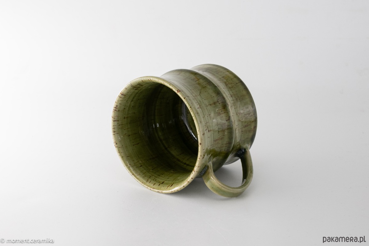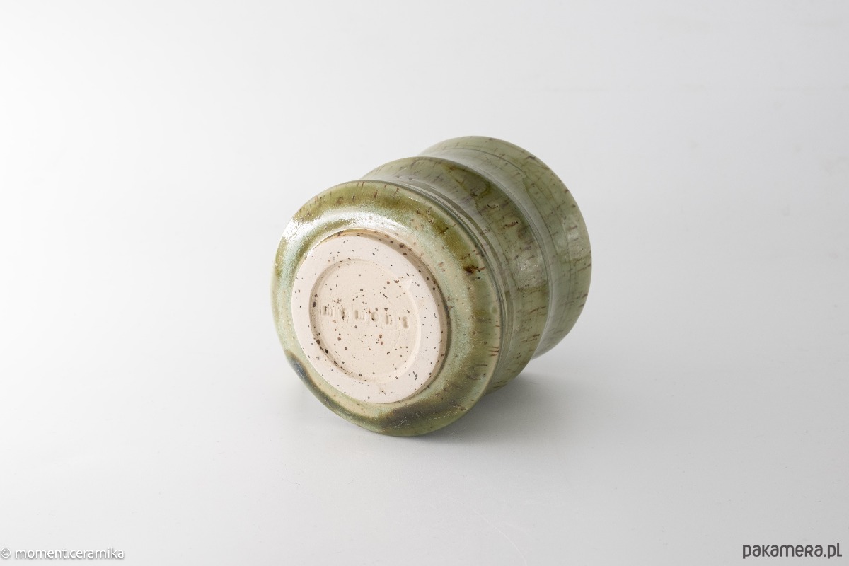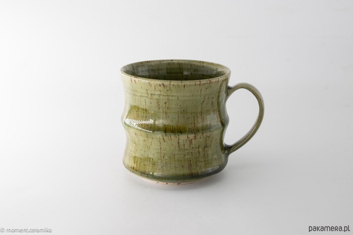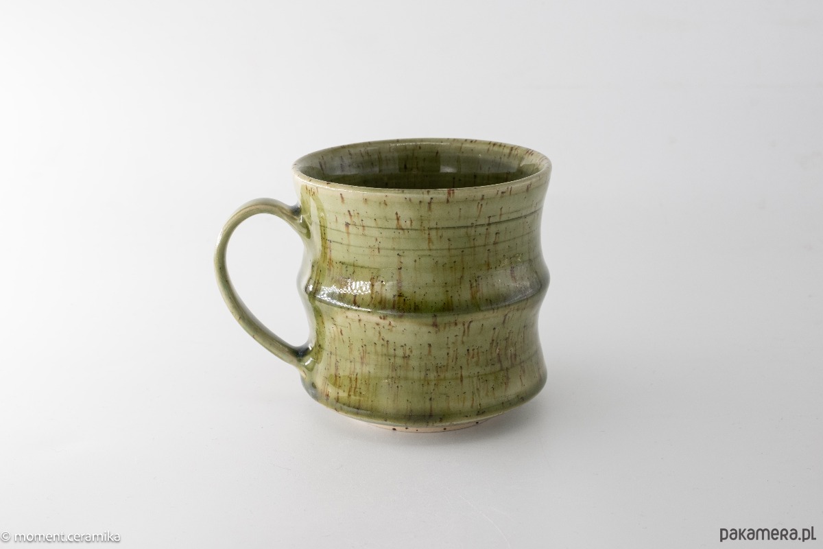 Kubek wykonany na kole garncarskim z beżowej gliny w ciemne kropki, poszkliwiony zielonym półtransparentnym szkliwem. Kształtem przypomina pień bambusu.