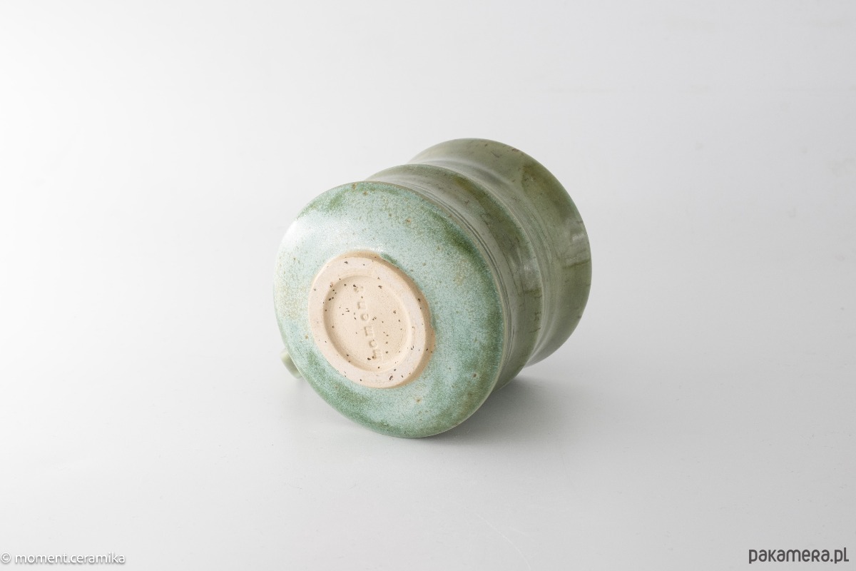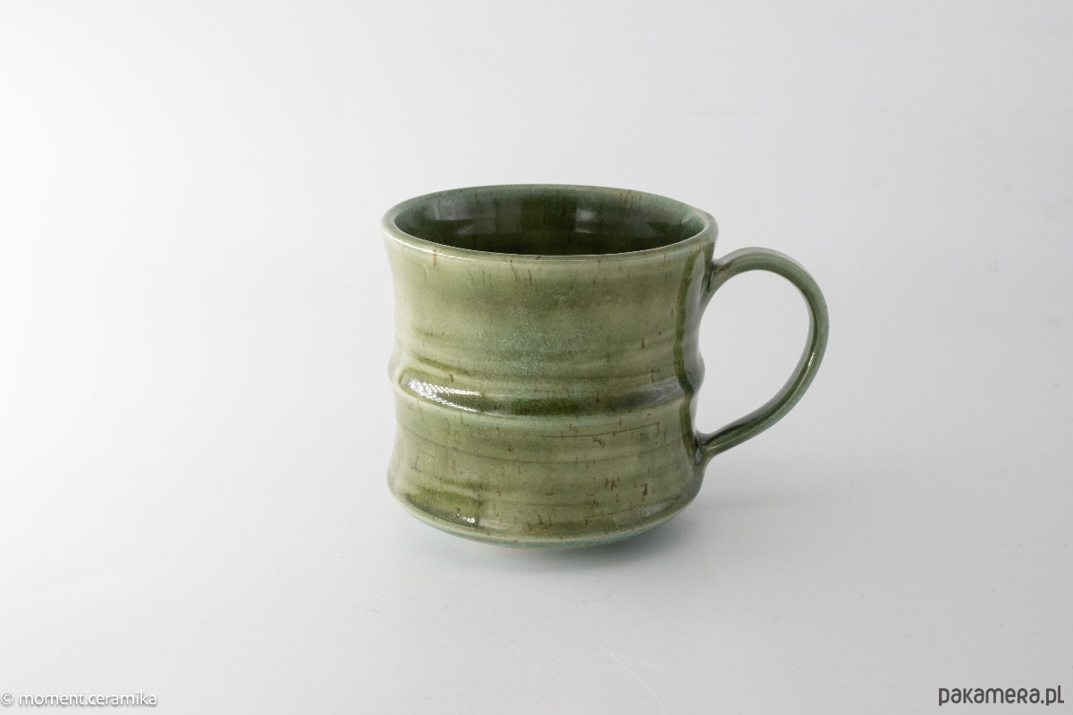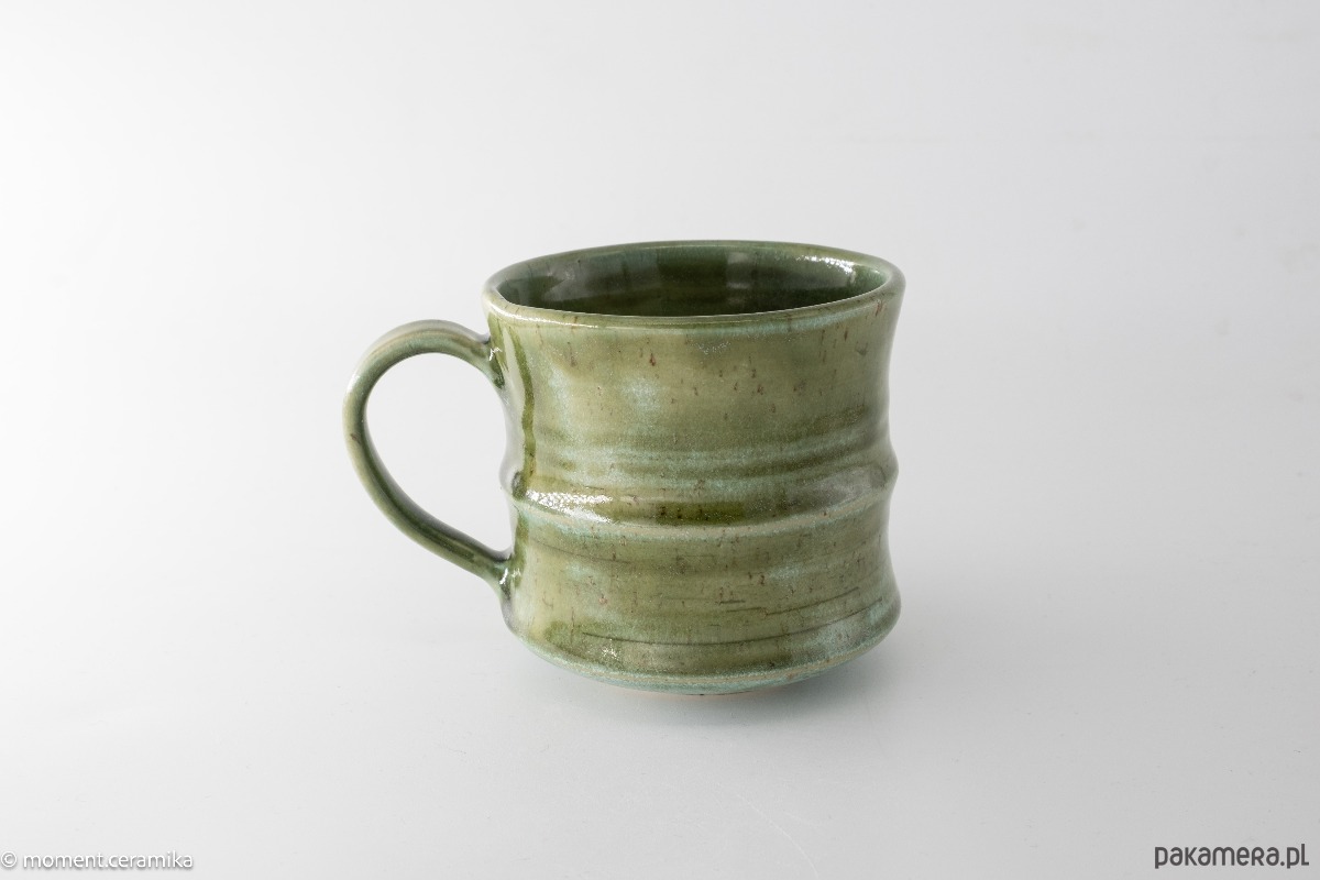 Kubek wykonany na kole garncarskim z beżowej gliny w ciemne kropki, poszkliwiony zielonym półtransparentnym szkliwem. Kształtem przypomina pień bambusu.