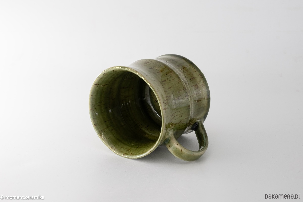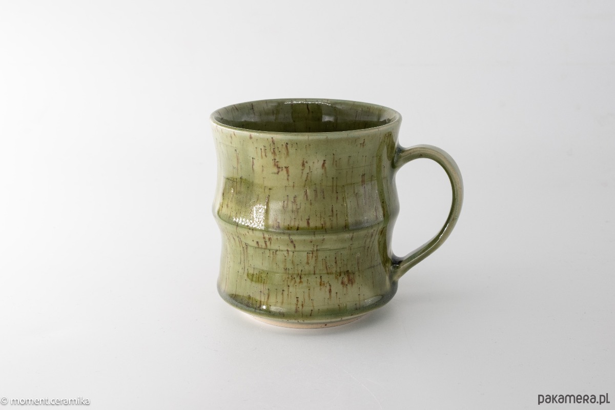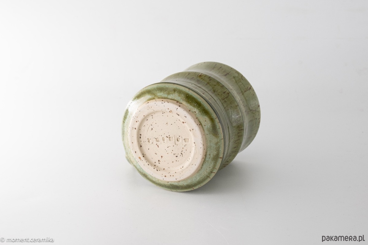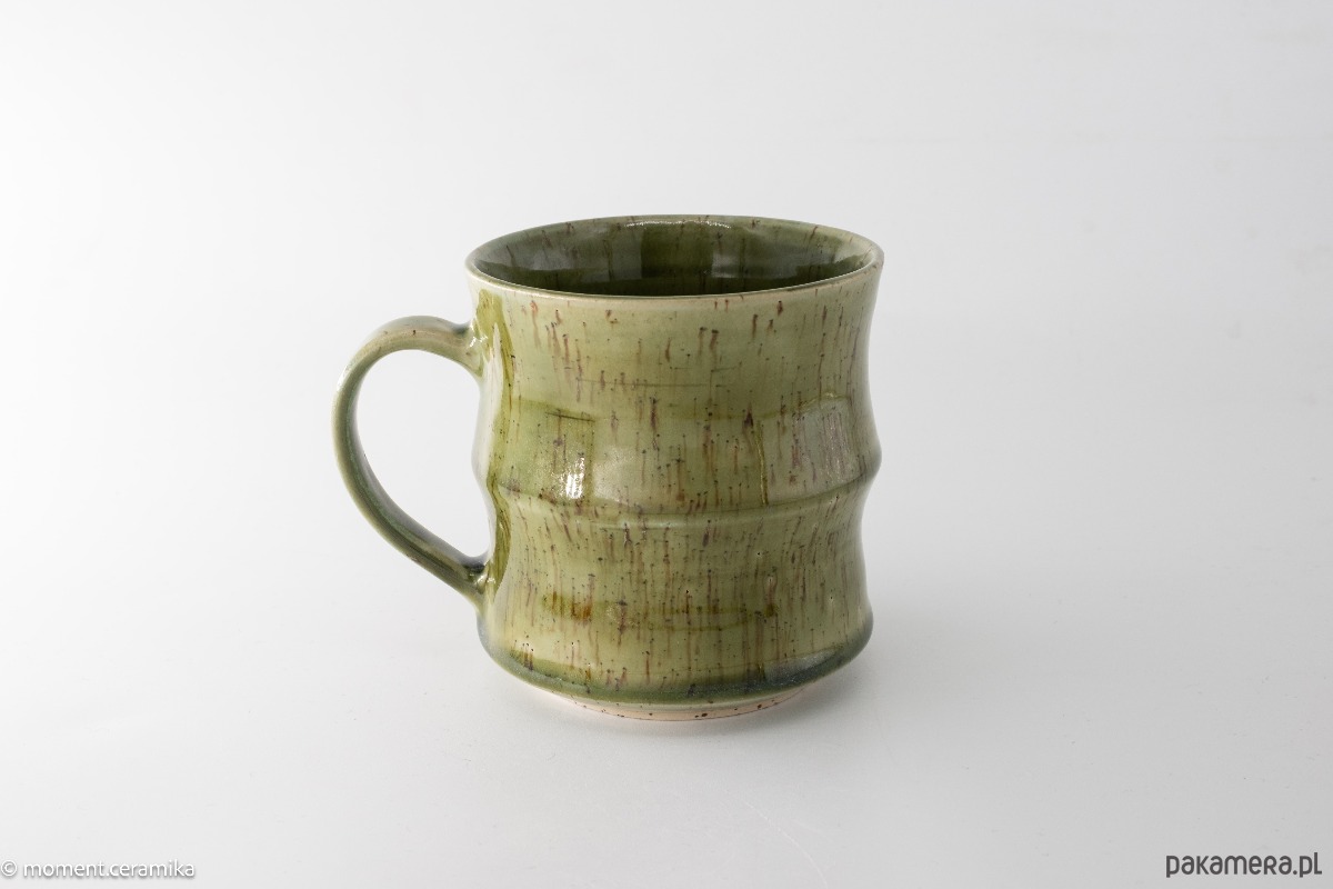Kubek wykonany na kole garncarskim z beżowej gliny w ciemne kropki, poszkliwiony zielonym półtransparentnym szkliwem. Kształtem przypomina pień bambusu.