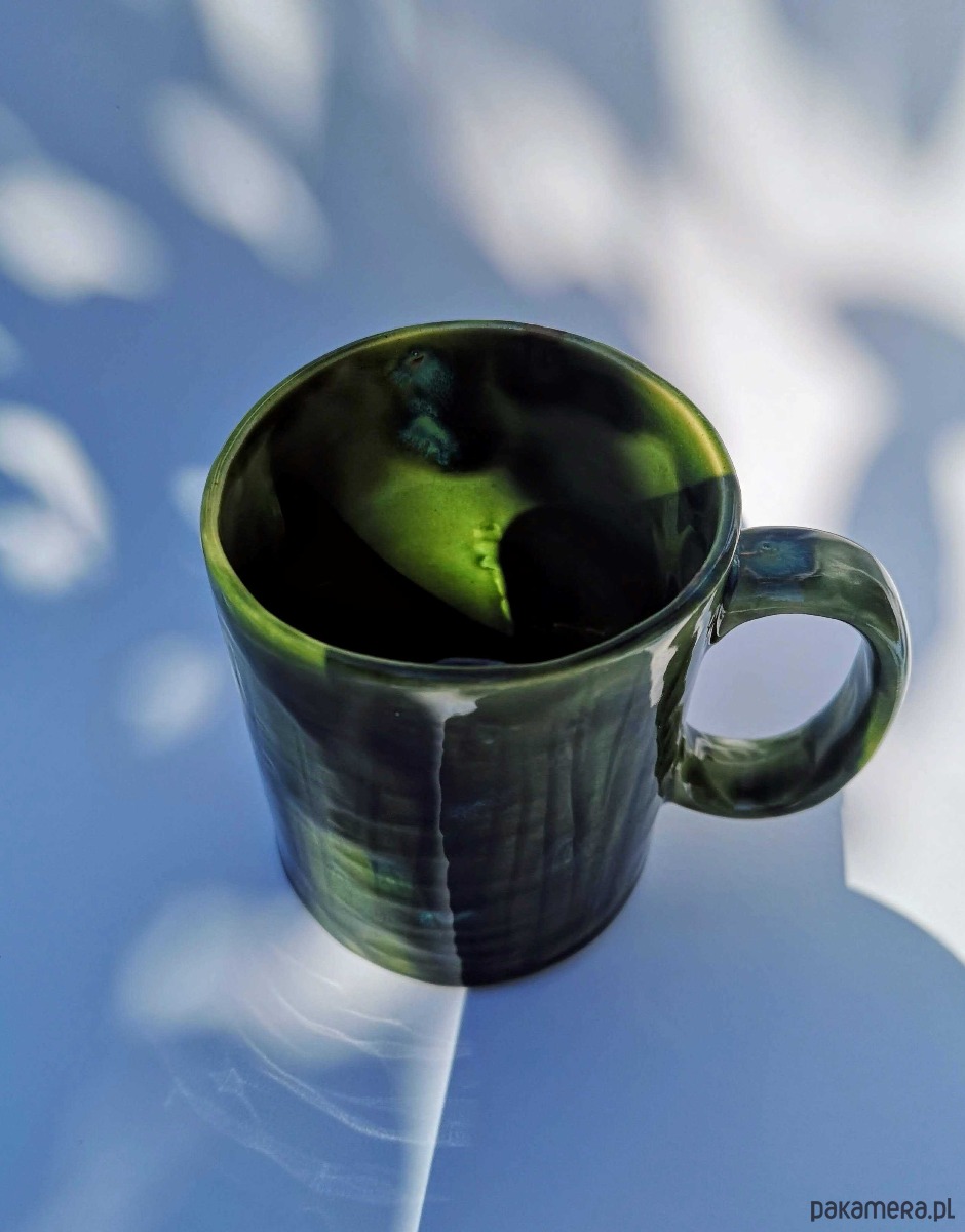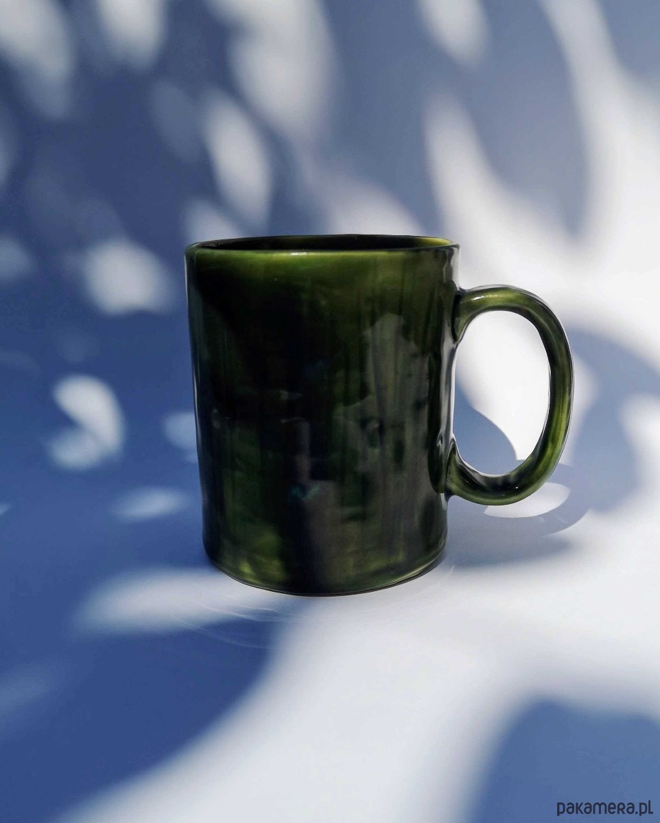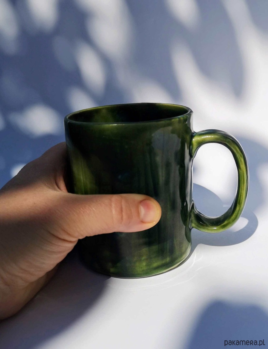Klasyczny kubek w kolorze głębokiej zieleni, wykonany z jasnej gliny w podpoznańskiej pracowni ceramicznej. Pojemność kubka ok 400 ml.