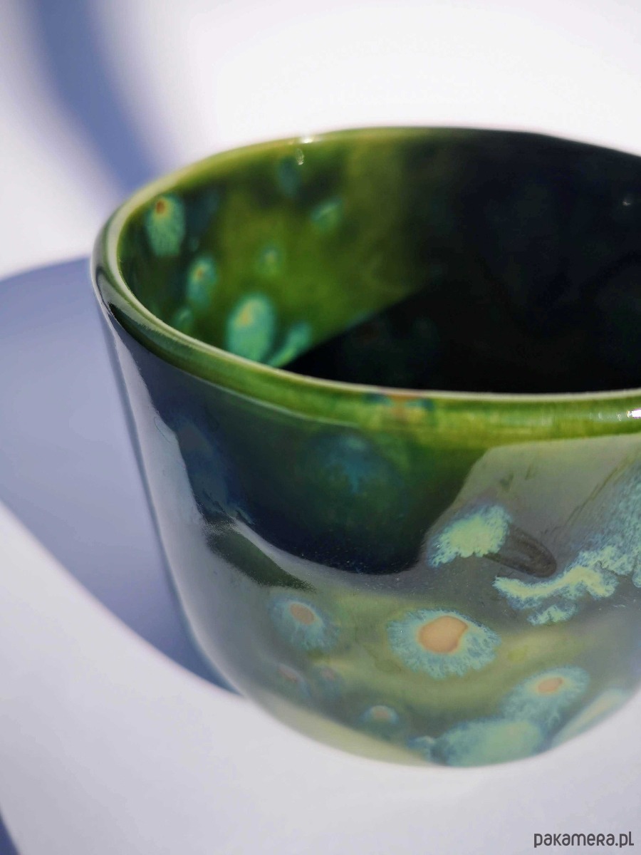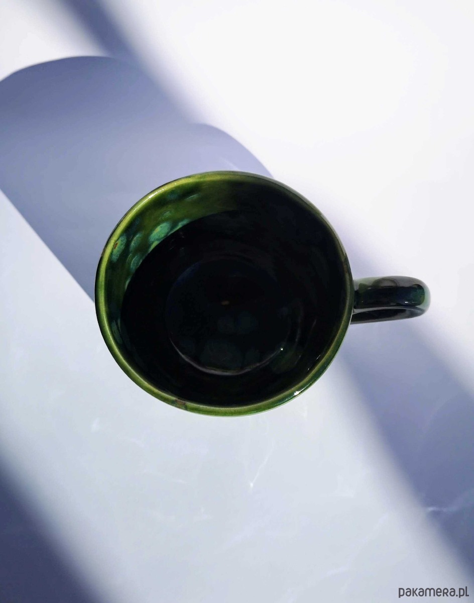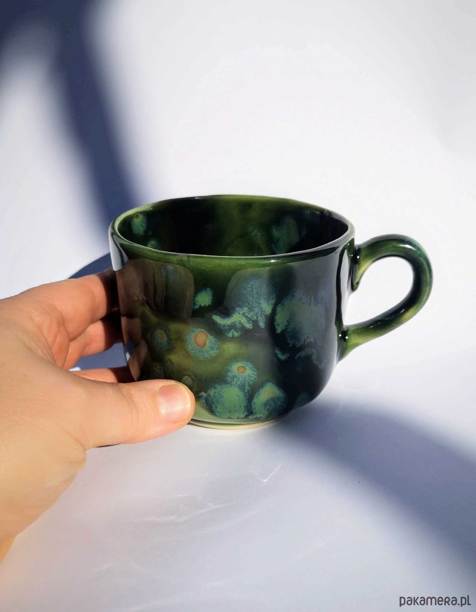 Kubek „zielony mech” wyróżnia się głębokim odcieniem zieleni, przełamany subtelnymi, turkusowymi przebłyskami, co nadaje mu wyjątkowego charakteru. Jego pojemność około 350 ml sprawia, że jest to doskonałe naczynie do serwowania pysznej kawy, aromatycznej herbaty, przez zdrowe napary ziołowe, czy czekoladę. Każdy kubek jest wyjątkowy, unikalny, wykonany z jasnej gliny, będzie wspaniałym dodatkiem do Twojej kuchni. Umili poranki oraz długie wieczory z ulubionym naparem. Naczynie to jest nie tylko estetyczne, ale również funkcjonalne – można je myć w zmywarce, co ułatwia jego użytkowanie.